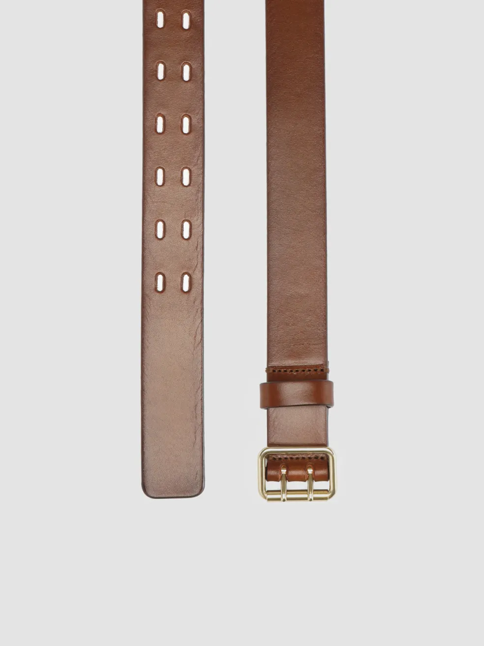 Great for pairing with contemporary and sophisticated looks, our OC Strip belt is handcrafted from smooth light brown leather. It reveals a rounded rectangular gold-tone metal buckle, double rows of holes and our golden lettering logo printed inside.