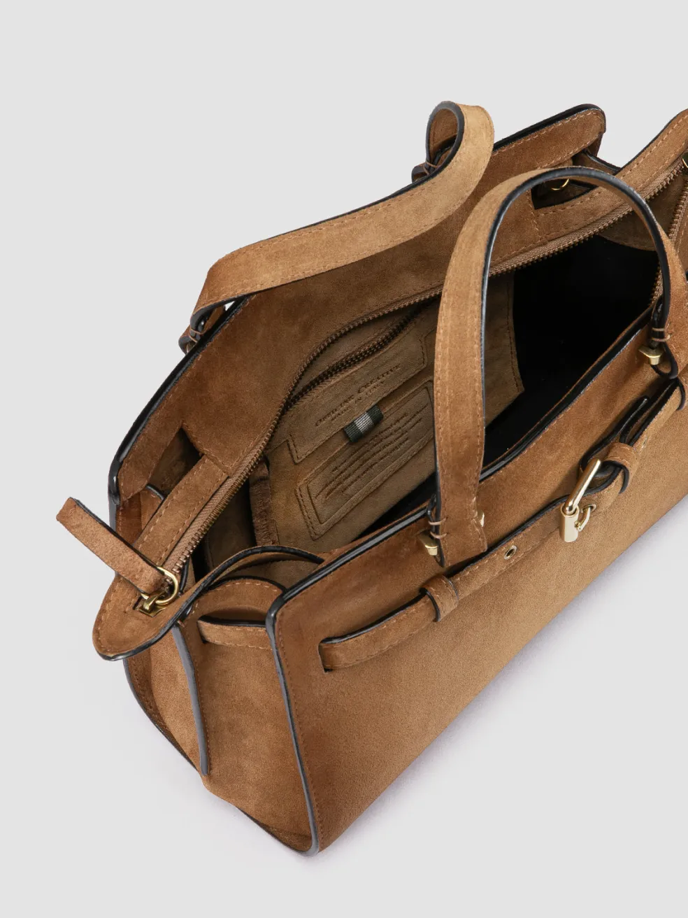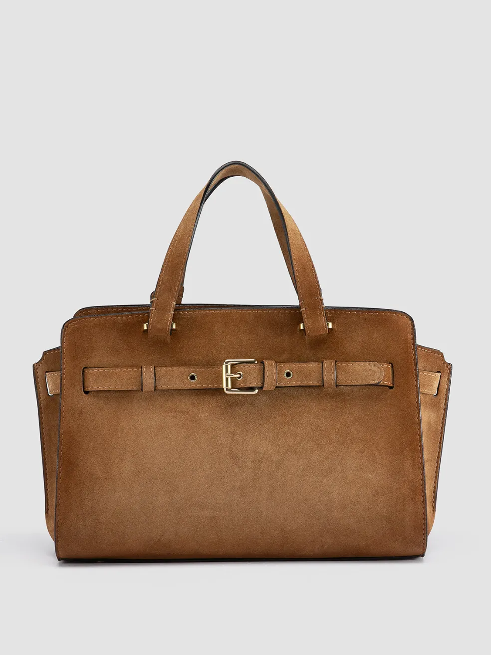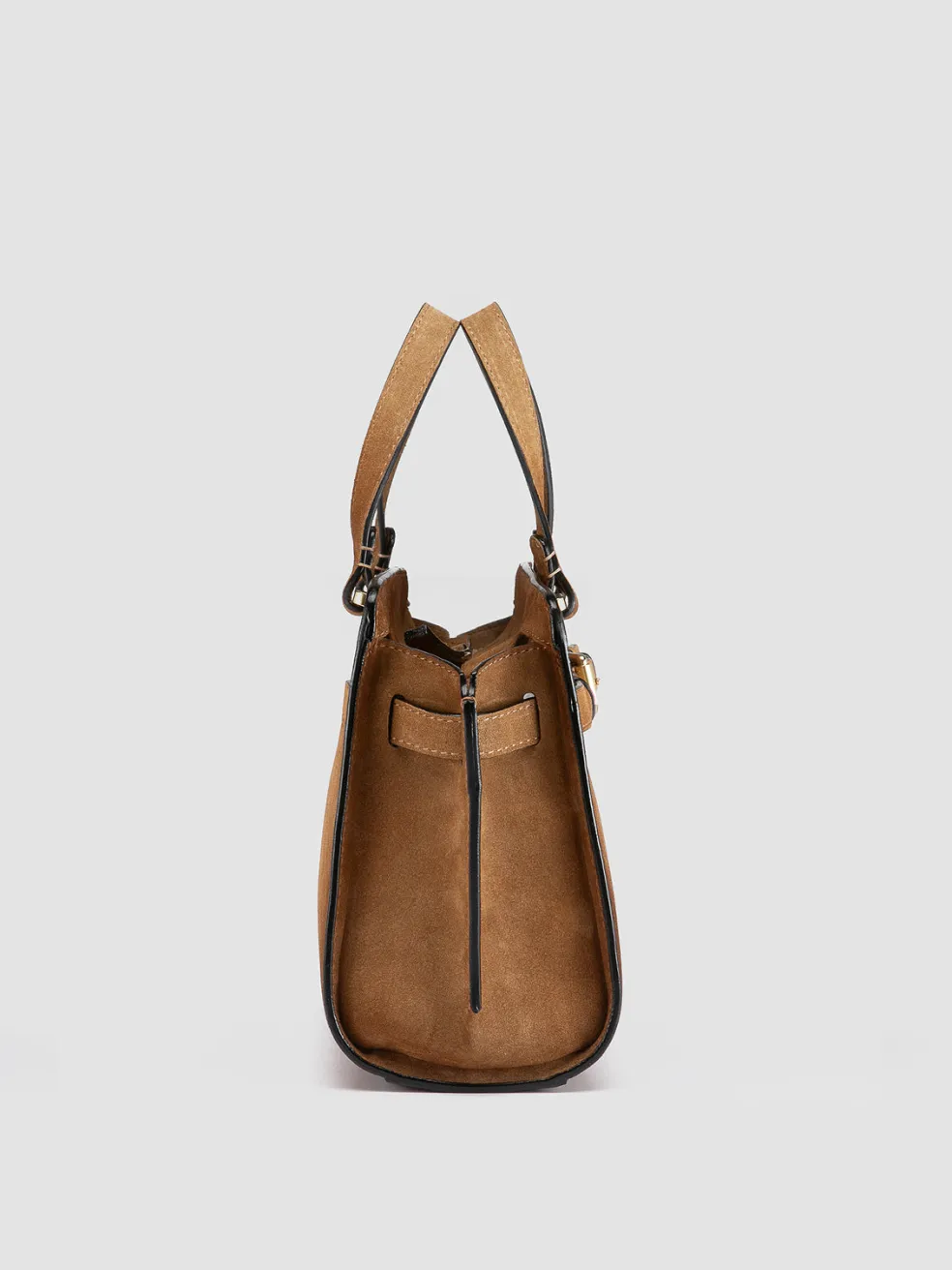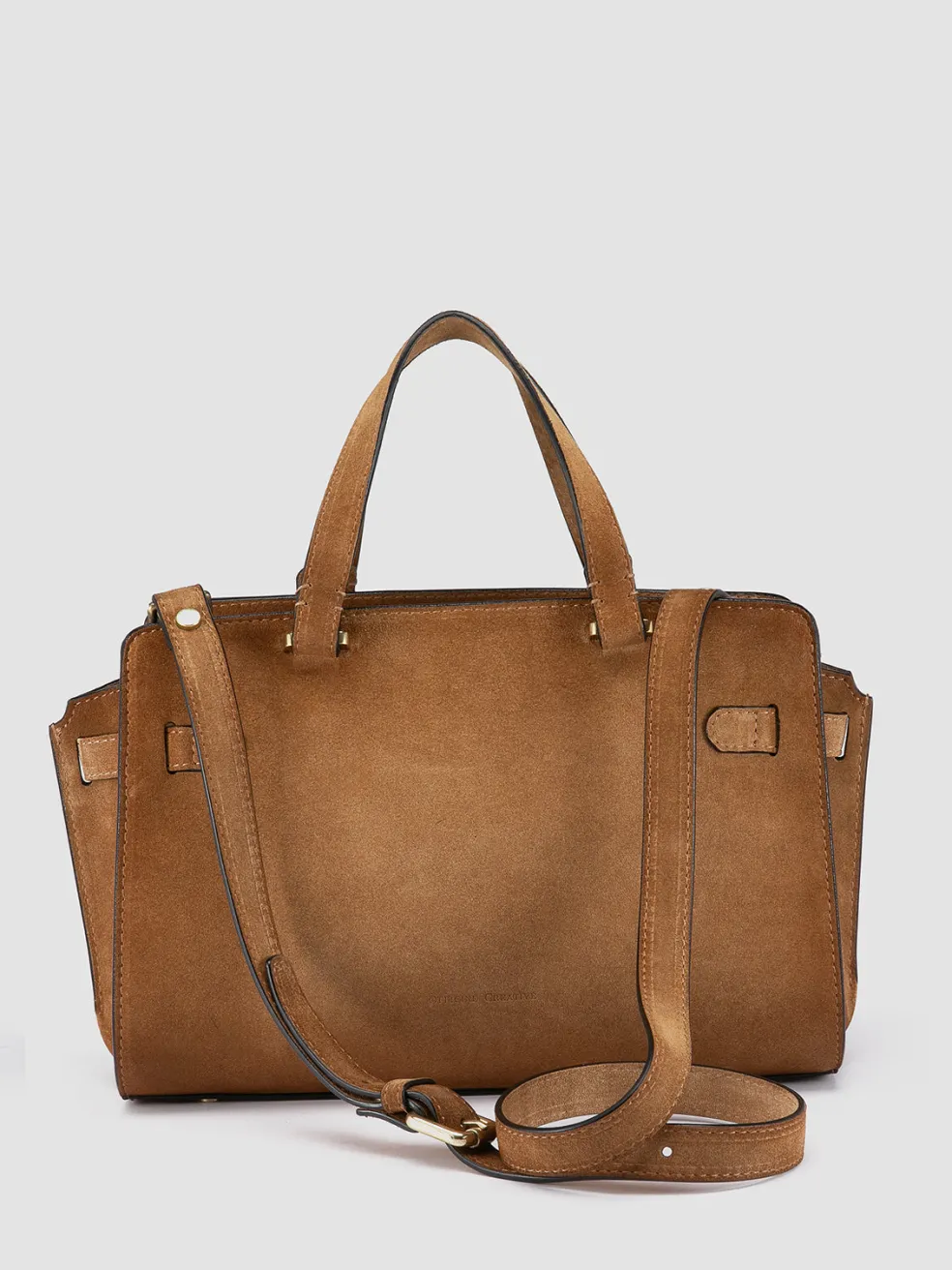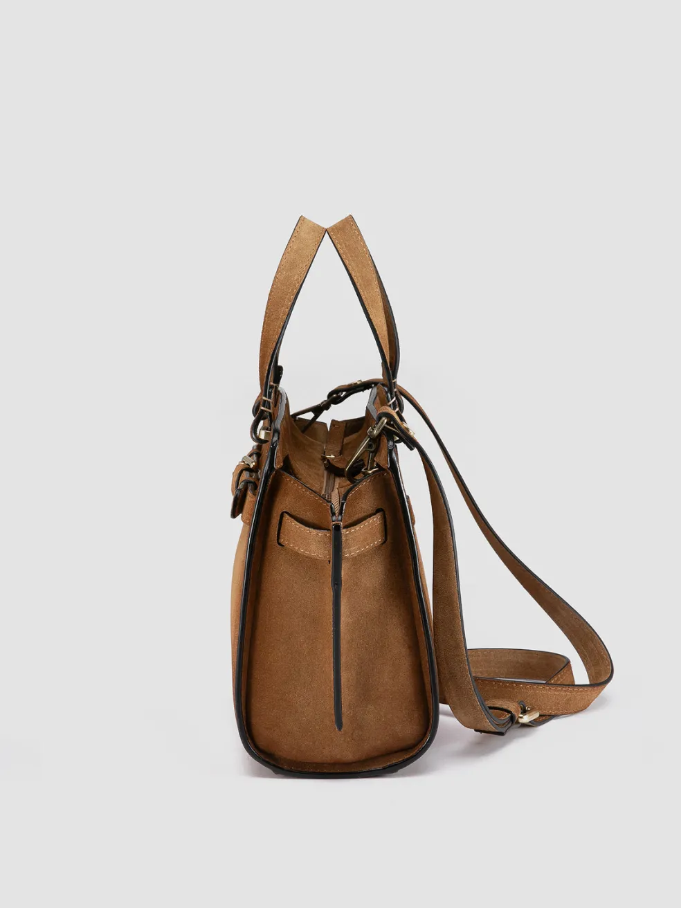 The Saddle 019 bag showcases a blend of craftsmanship and vintage allure. Handmade in Italy from supple brown suede, it presents two top handles, a horizontal strap for size adjustment and an optional shoulder strap.