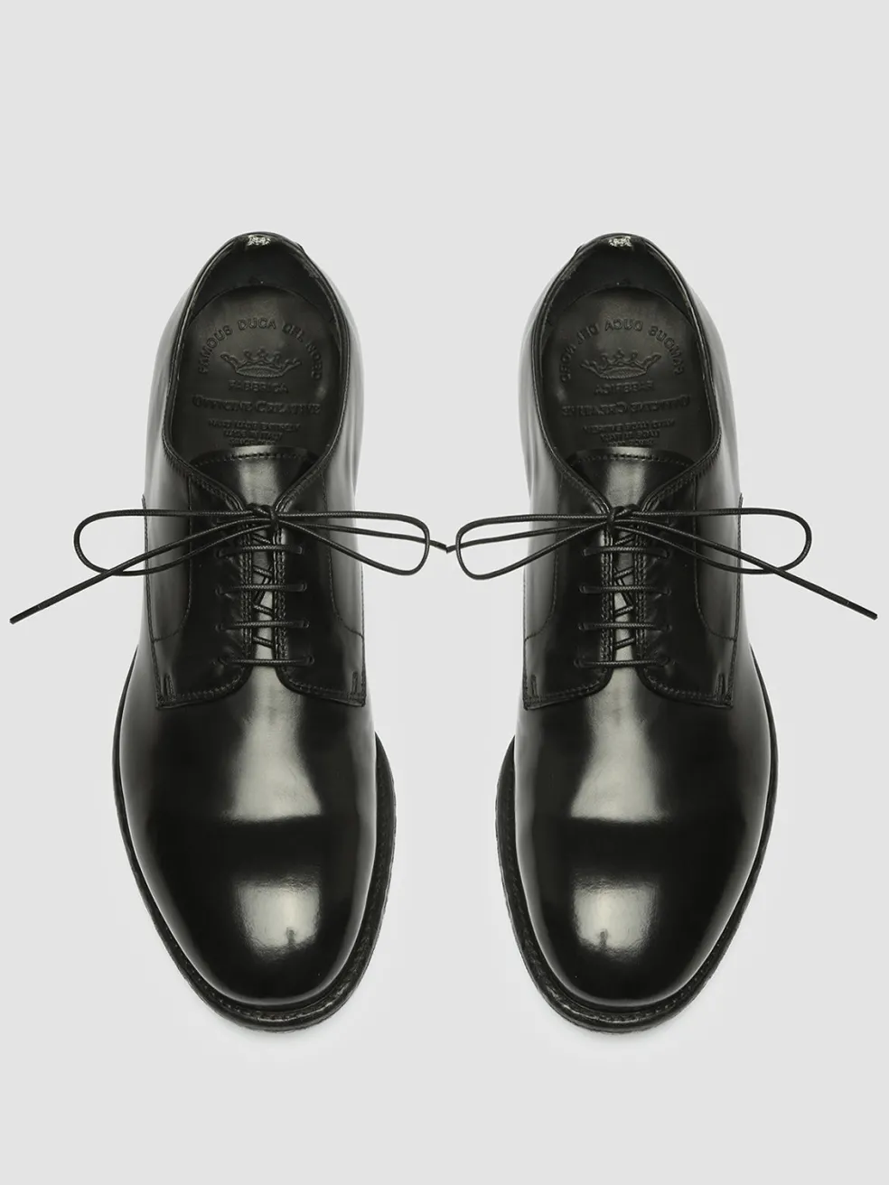 With their classic and timeless style our Emory derbies will win you over thanks to their exceptional craftsmanship. They have a black precious leather upper made unique and inimitable by the airbrushed manufacture that gives a highly refined shaded finish. They feature an almond toe thin waxed laces and a caoutchouc sole with a stacked heel.
