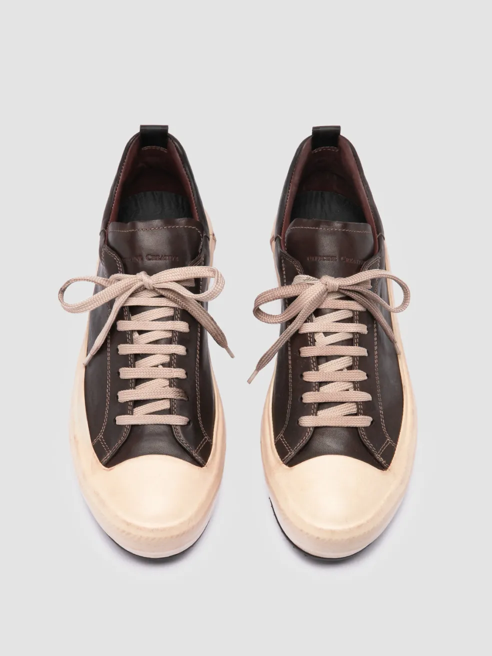 The Mes DD 001 sneakers blend retro charm with luxe craftsmanship. Handmade in Italy from brown leather, they sport a distinct stitched upper with deep-dyed finish, set on an encased rubber sole for effortless aesthetic and comfort.