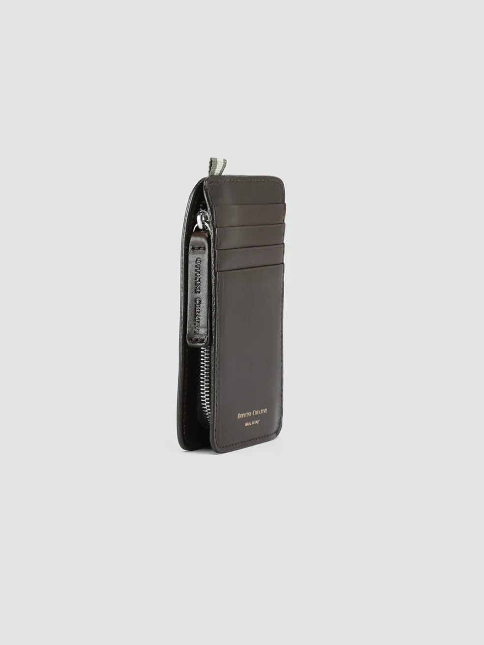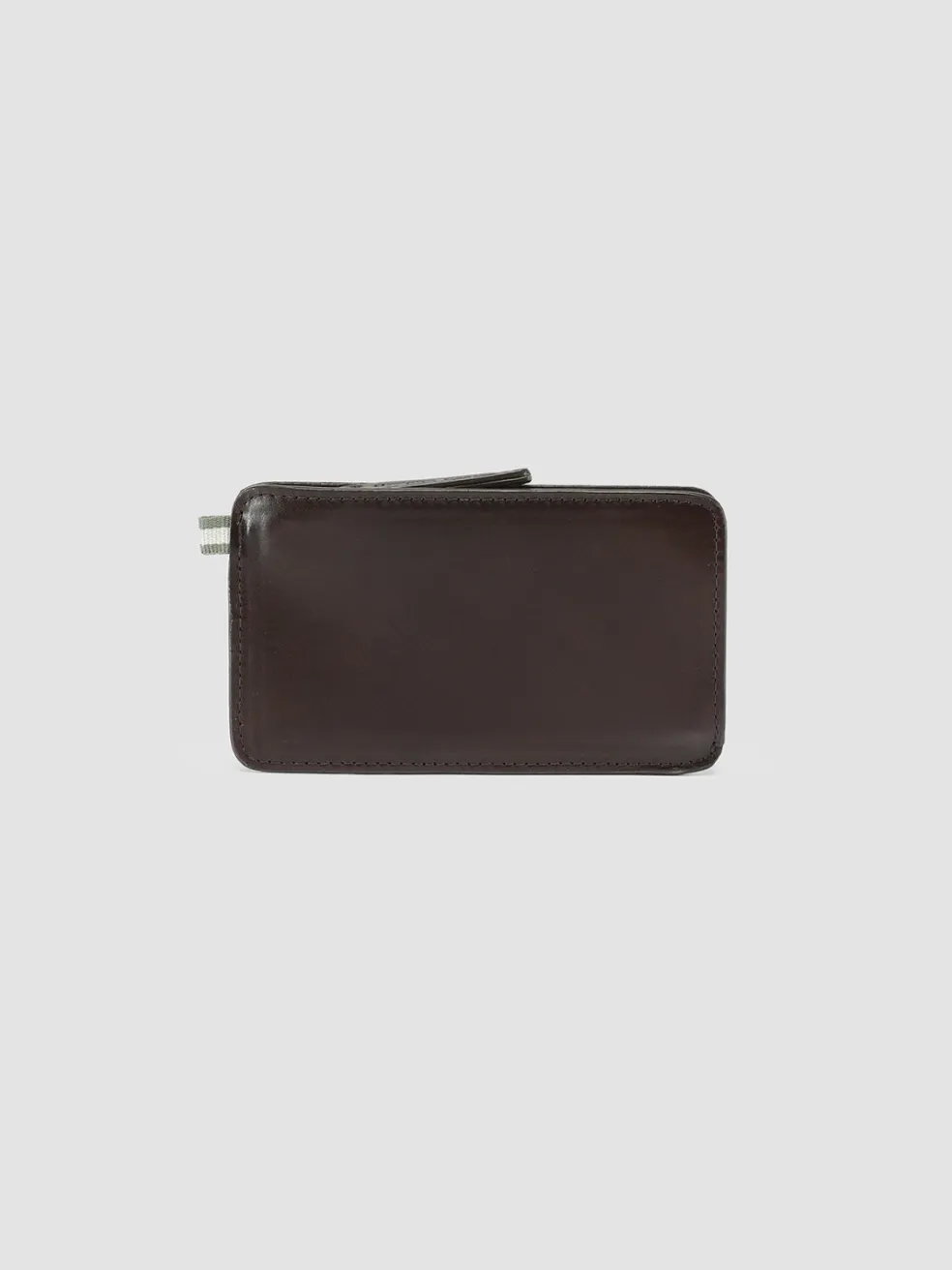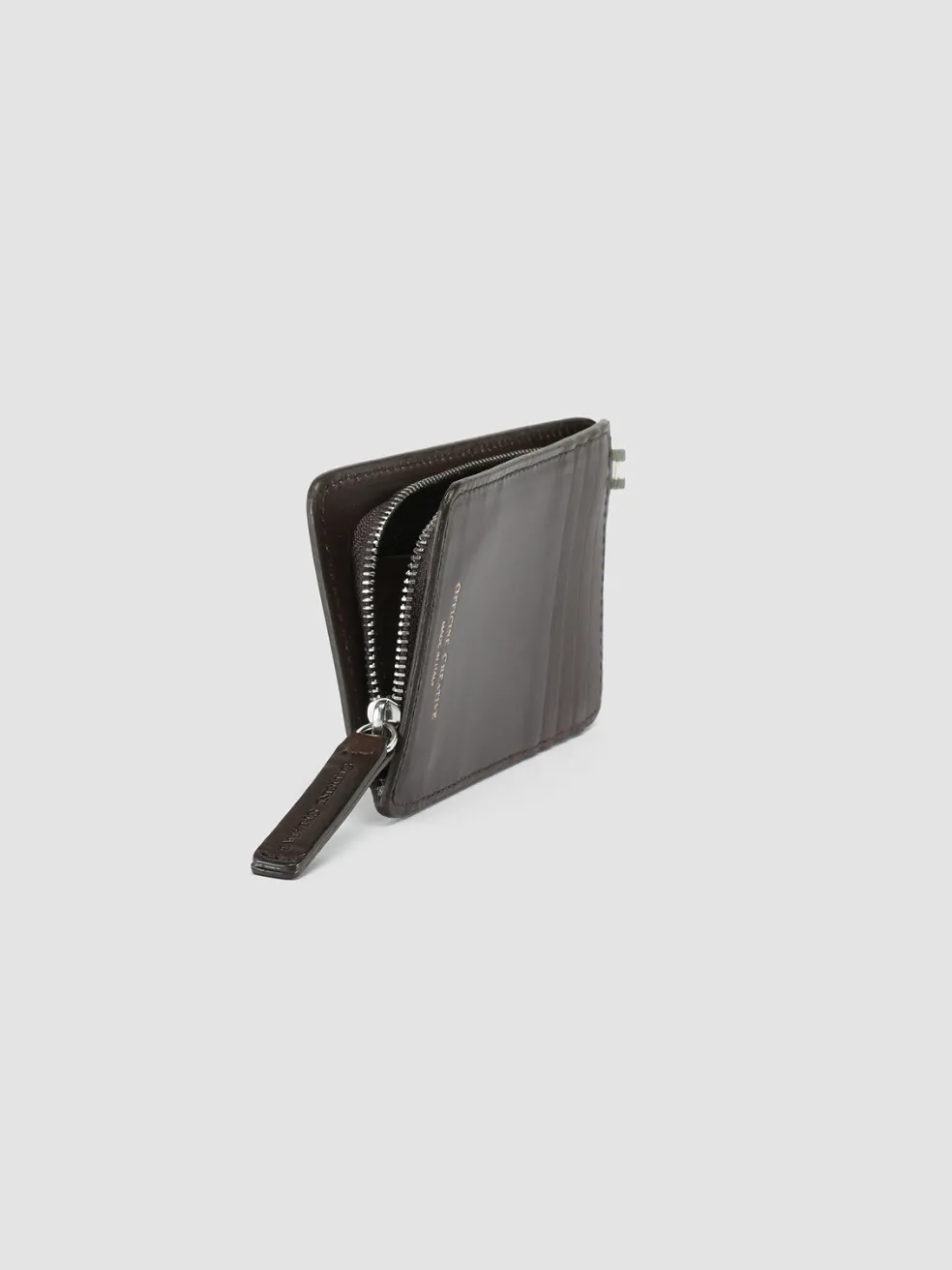 Our Bergè card holder is handcrafted from fine smooth leather in coffee tone. It reveals four card slots, embossed gold-tone lettering logo, signature grosgrain loop tab on the side and pocket with silver-one metal zip fastening.