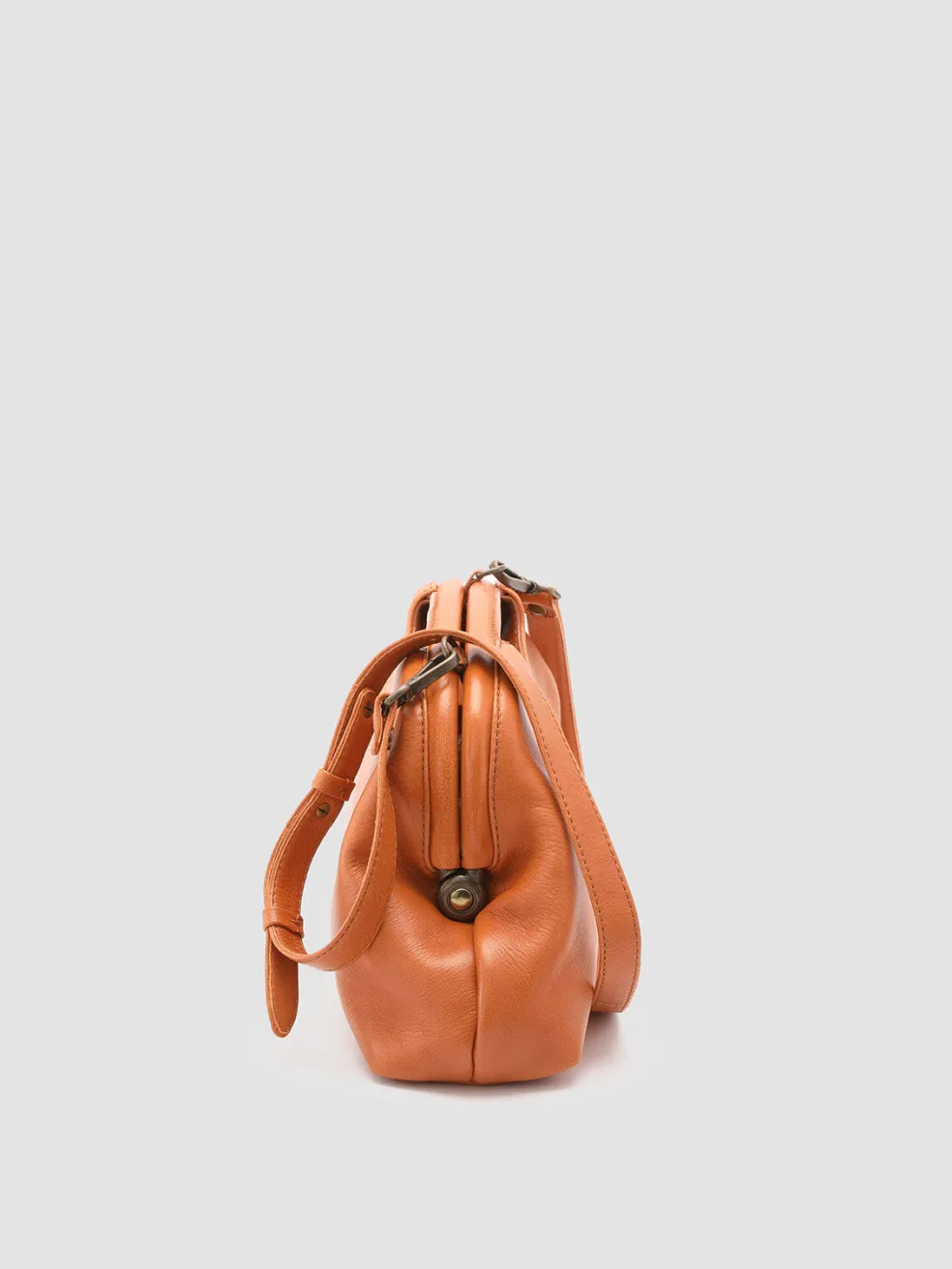 The Helen 02 leather clutch bag is handcrafted in Italy in a sleek orange silhouette with a distinctive oval cut-out handle. The detachable shoulder strap offers versatile carrying options, while the fabric-lined interior is secured by a magnetic button.