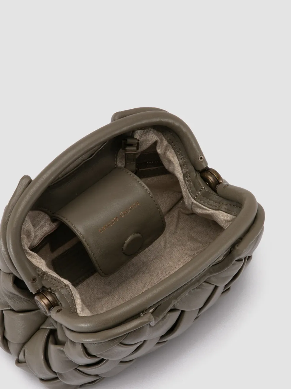Great for special occasions and to embellish any look, our Helen small clutch bag stands out with its expertly green woven leather texture. It features two rigid top handles, adjustable and detachable thin shoulder strap, fabric lining, internal panel with magnetic button fastening and embossed lettering logo, inside zip pocket and antiqued gold-tone metal hardware.