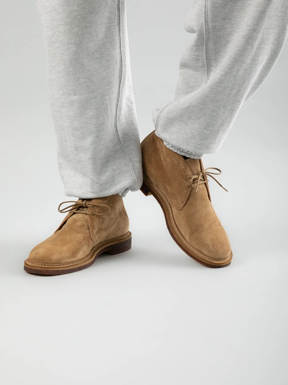 Our Hopkins chukka boots catch the eye thanks to their flawless handcrafted design. Made from premium tan suede, they reveal a comfortable silhouette with rounded toe, thin waxed laces, signature grosgrain back loop tab and a crepe sole.