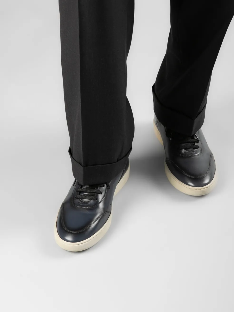 Our Kris Lux sneakers reveal a nonchalant and sophisticated design. Handmade by our artisans from smooth navy blue leather, they have a rounded toe, tone-on-tone laces, gold-tone lettering logo printed on the tongue and back patch, signature grosgrain heel loop tab and a flexible natural rubber sole.