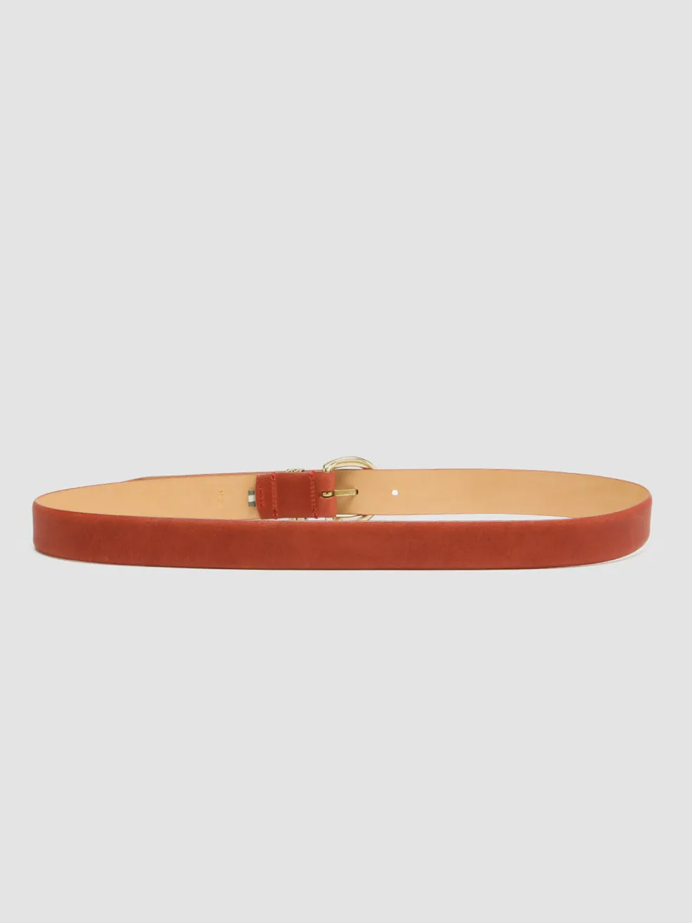 Expertly handcrafted from rust rose leather, our OC Strip artisan belt is a classic and versatile accessory. It features a semi-oval gold-tone metal buckle and our golden lettering logo embossed on the inside.