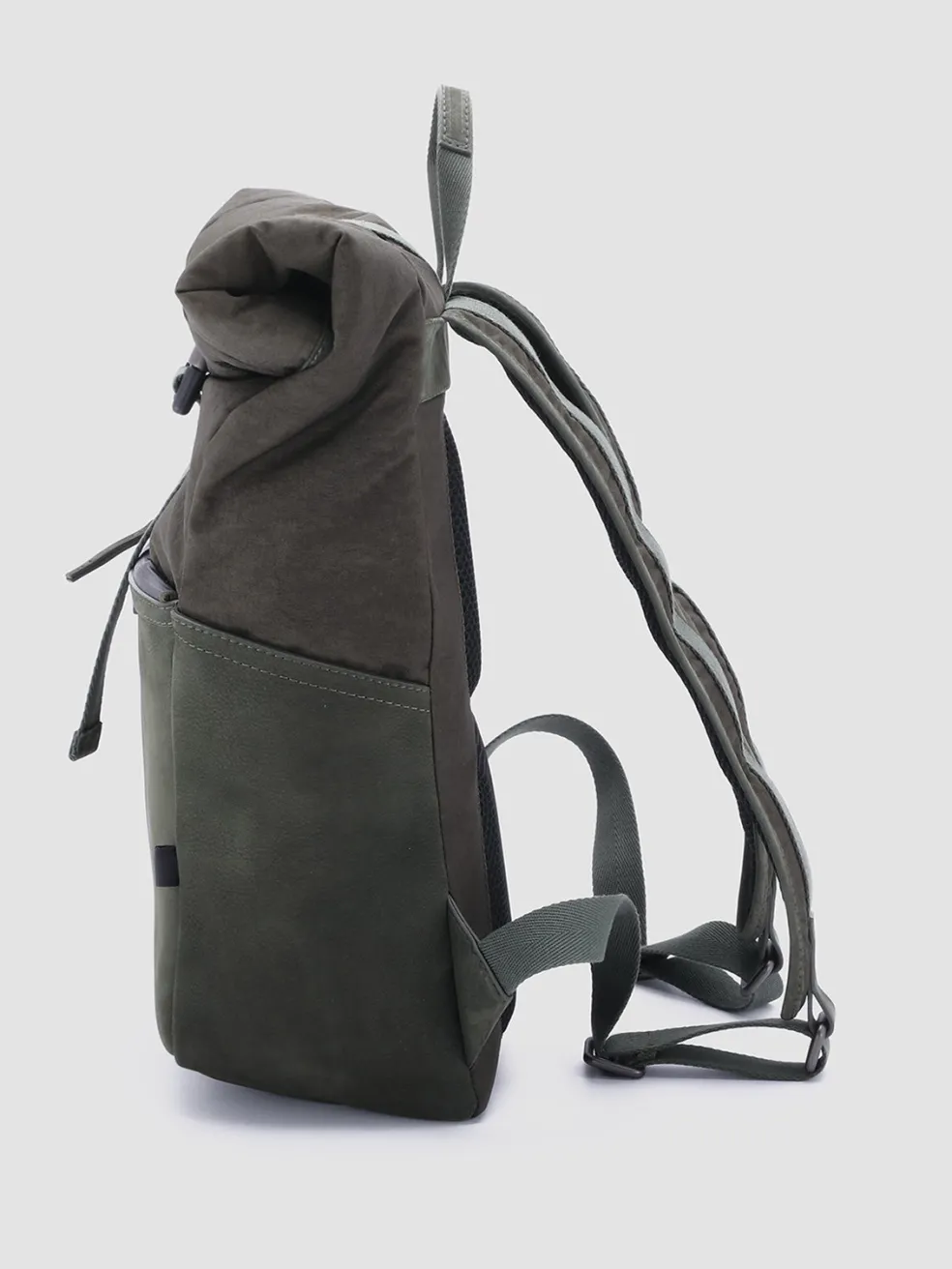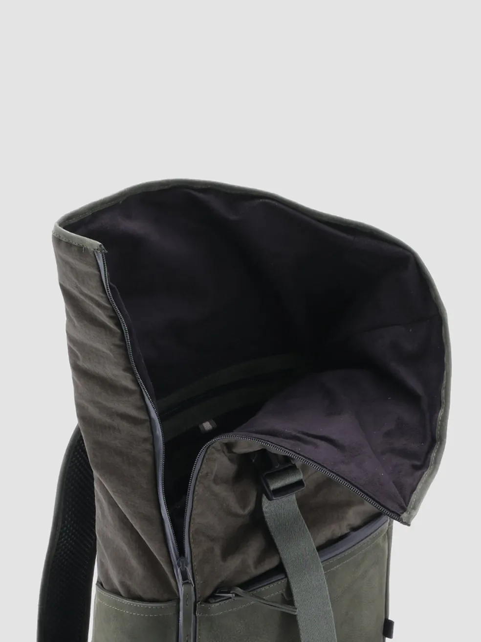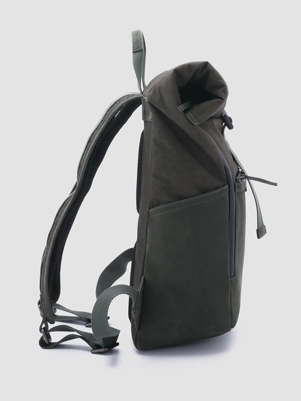 Our Pilot backpack reveals a practical and versatile sport-inspired design and an exceptional craftsmanship. It’s made from supple nabuk leather and nylon in shades of dark green and has a foldable main compartment closed by a side zip and a front hook a zipped pocket at front side open pockets back panel with mesh inserts adjustable rear shoulder straps an inner zip pocket and silver-tone metal hardware.