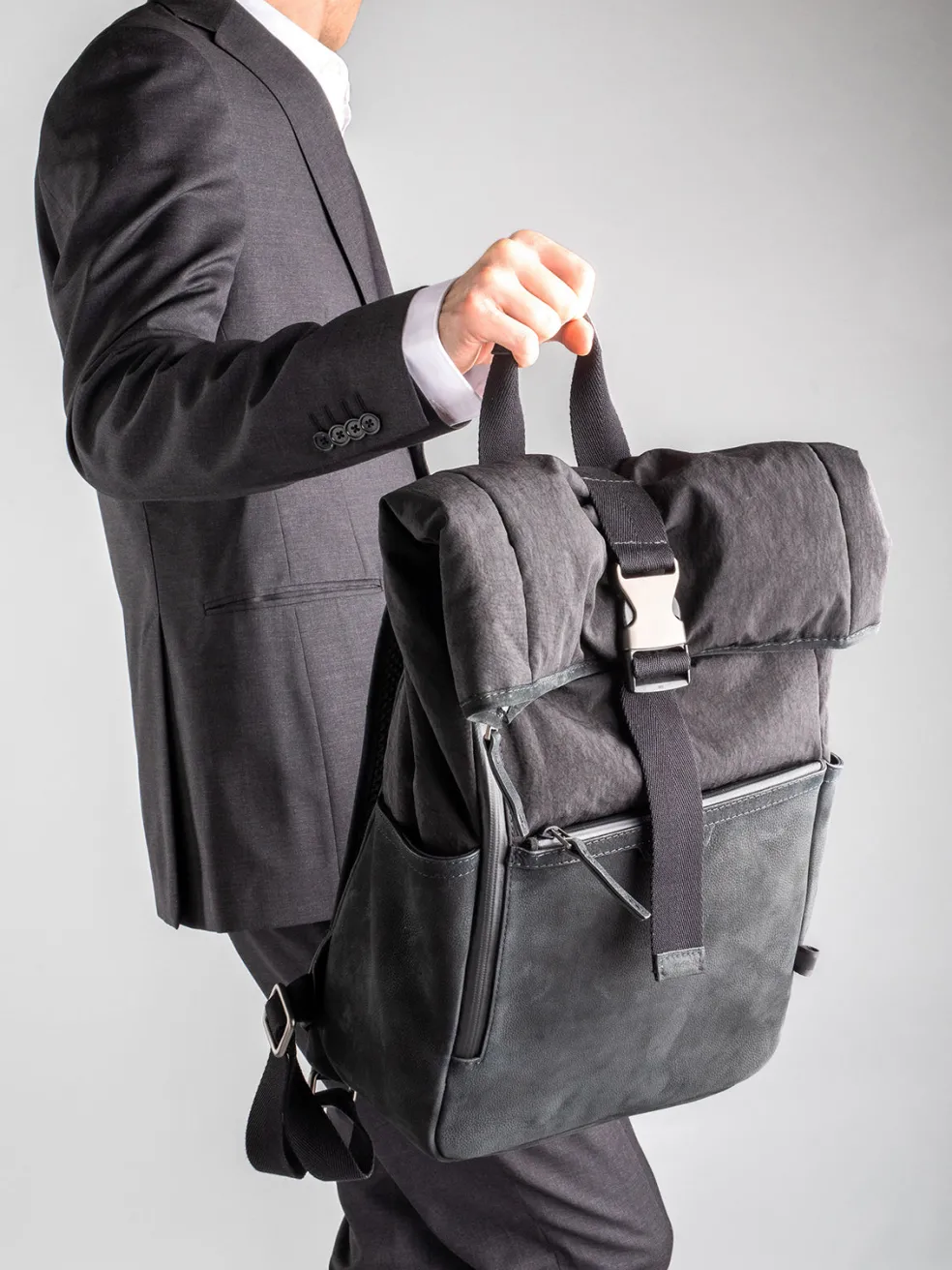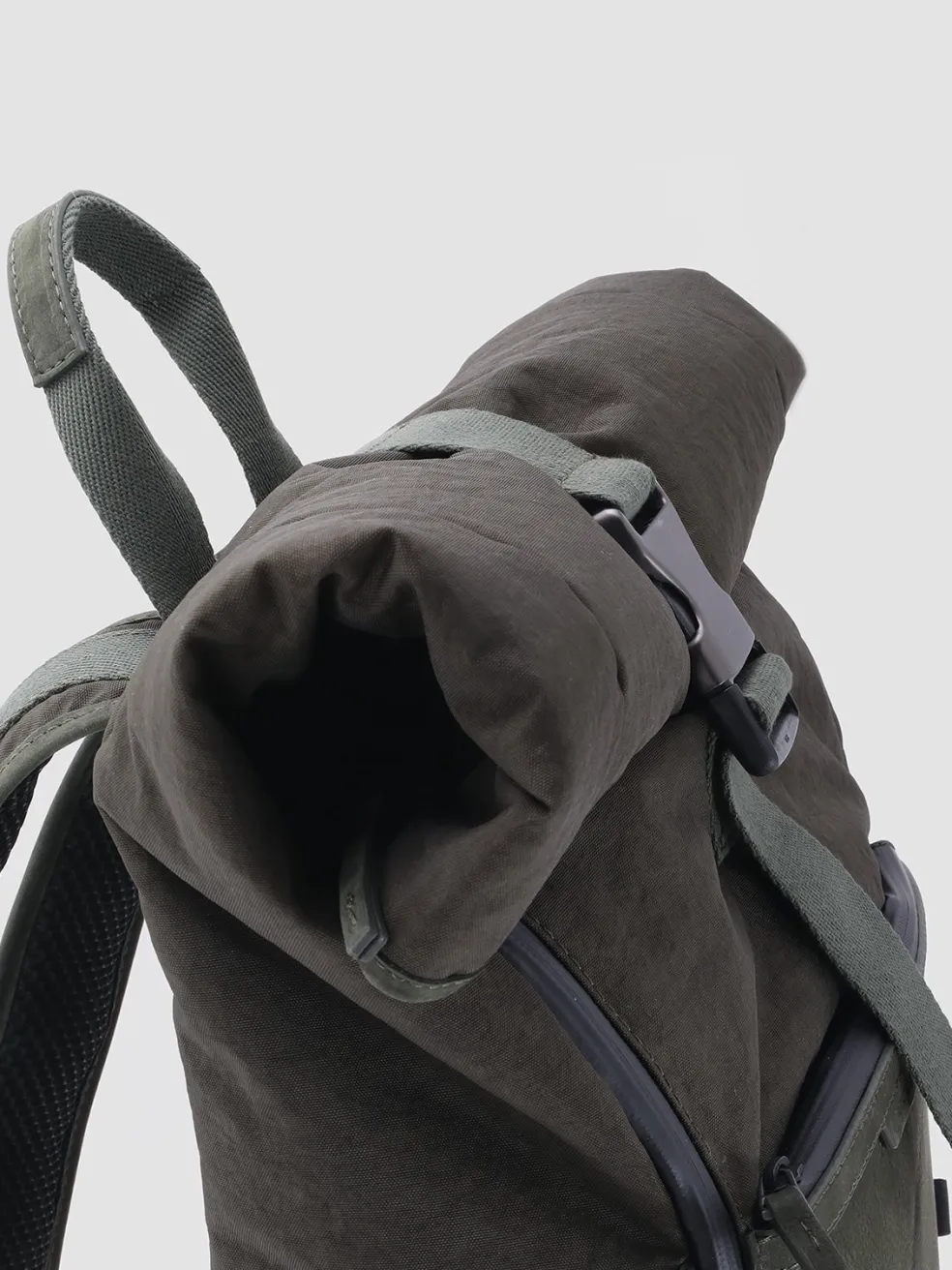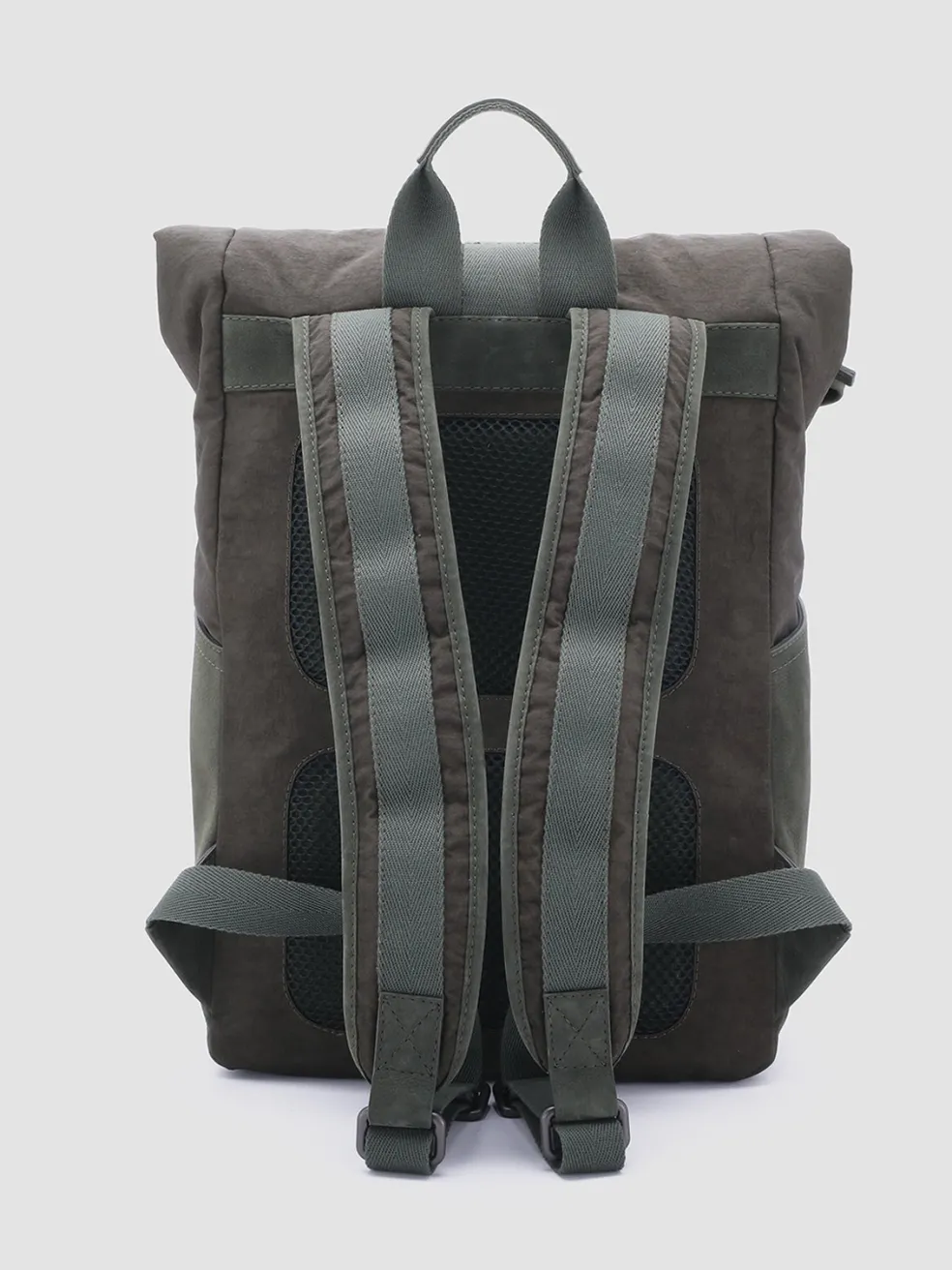 Our Pilot backpack reveals a practical and versatile sport-inspired design and an exceptional craftsmanship. It’s made from supple nabuk leather and nylon in shades of dark green and has a foldable main compartment closed by a side zip and a front hook a zipped pocket at front side open pockets back panel with mesh inserts adjustable rear shoulder straps an inner zip pocket and silver-tone metal hardware.
