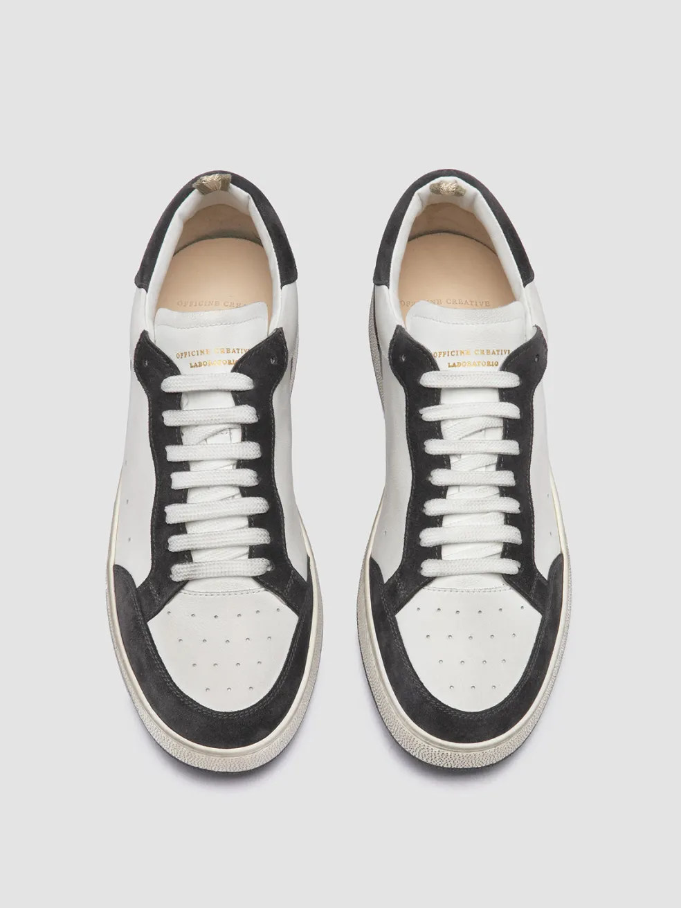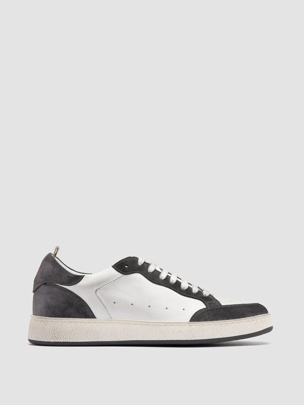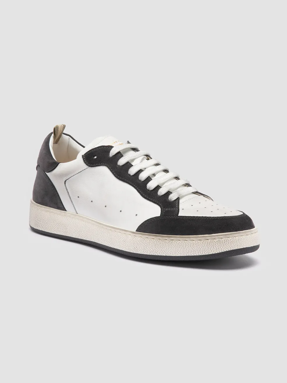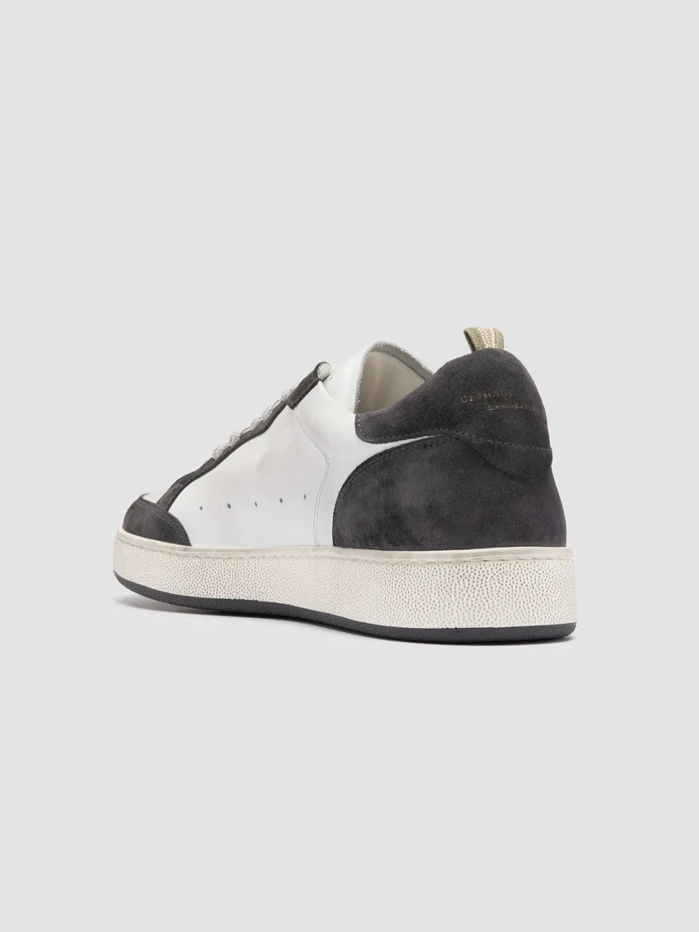 The Answer 001 low top sneakers are a response to the refined tastes of the OC clientele. Handmade in Italy from white leather, they feature contrasting grey suede details and a rubber sole built for endurance and grip.