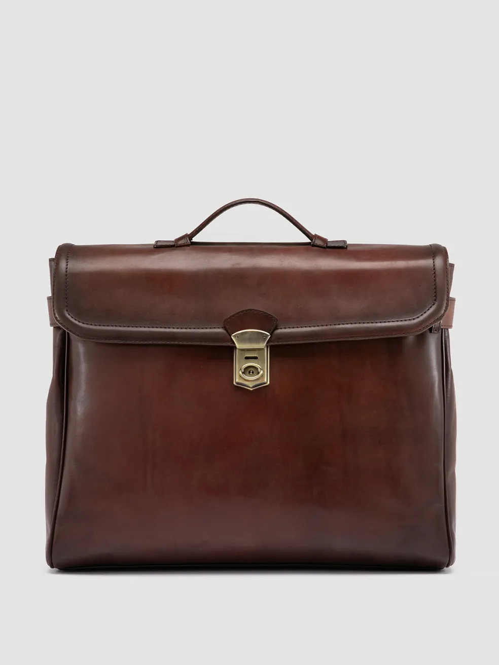 The Jerome 003 briefcase merges timeless flair with functional design. Handmade in Italy in brown leather, it features a top handle, a secure front clasp and a structured storage space, perfect for the discerning professional.