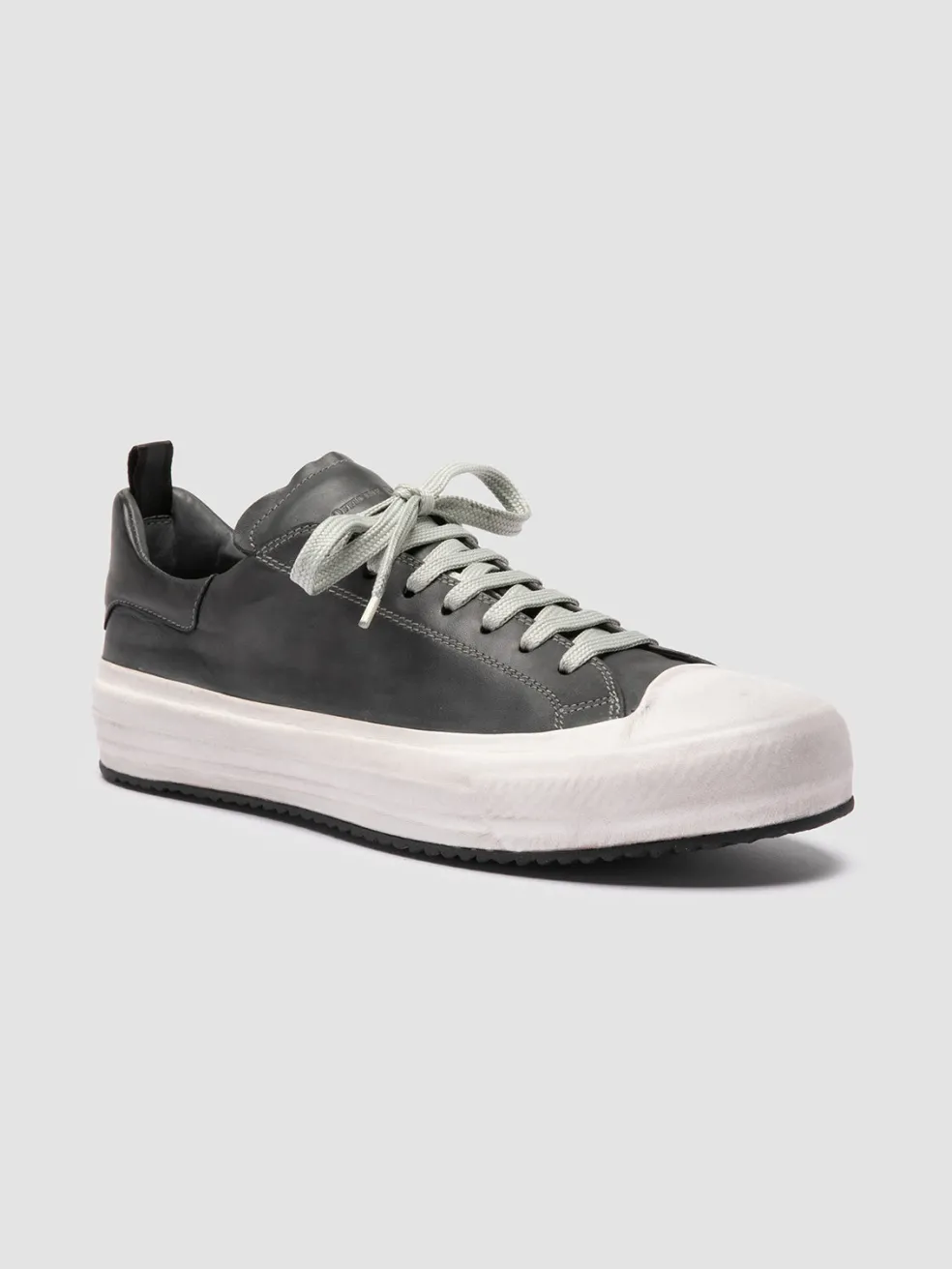 The Mes DD 001 sneakers blend retro charm with luxe craftsmanship. Handmade in Italy from grey leather, they sport a distinct stitched upper with deep-dyed finish, set on encased rubber sole for effortless aesthetic and comfort.