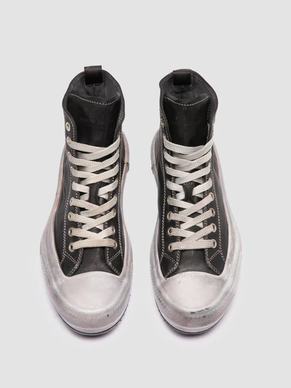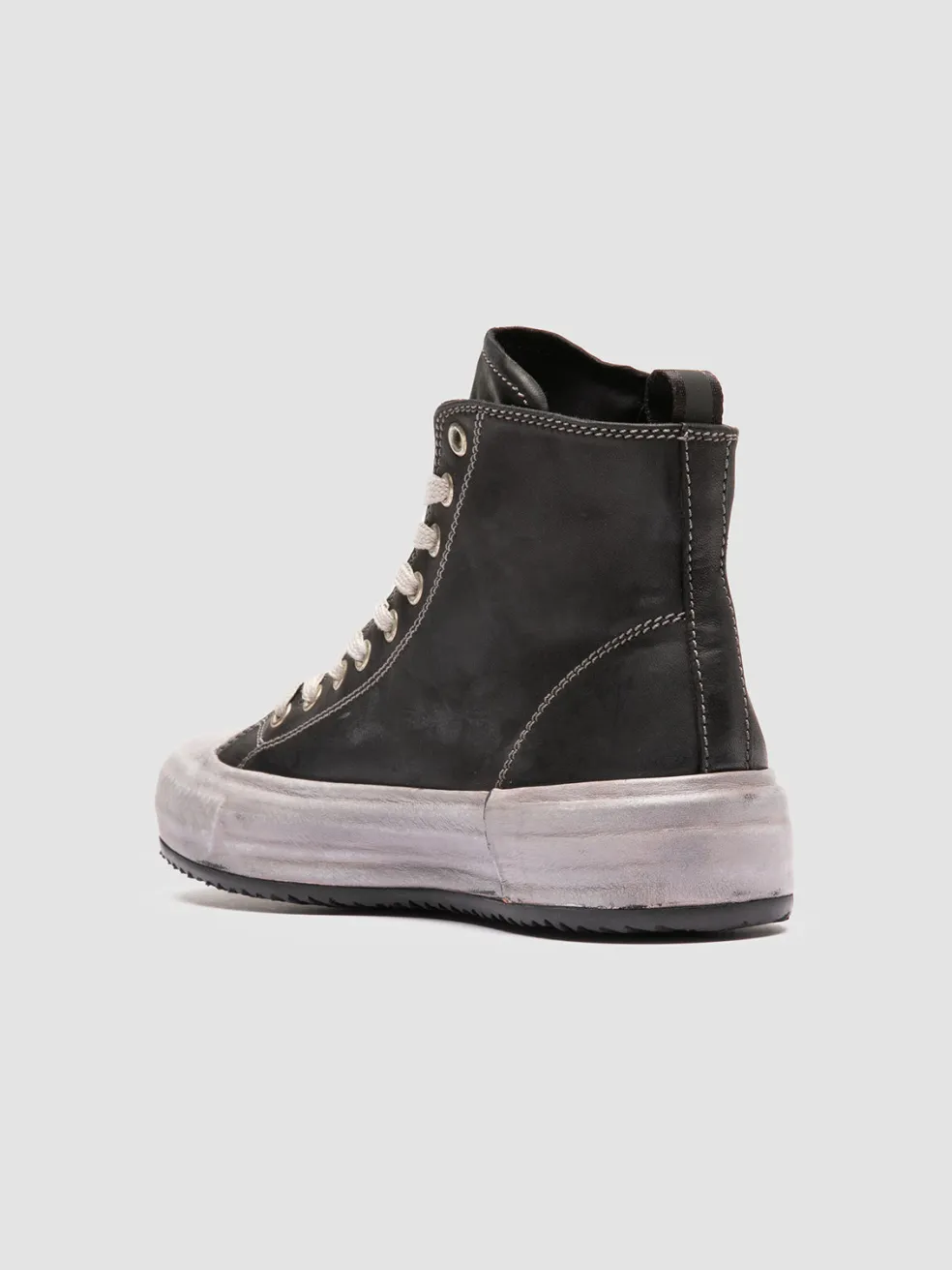 The Mes DD 102 marries high-end craftsmanship with a streetwise aesthetic. These high-top sneakers are handcrafted in Italy from black leather, with a carefully stitched and deep-dyed upper and an encased, durable rubber sole.