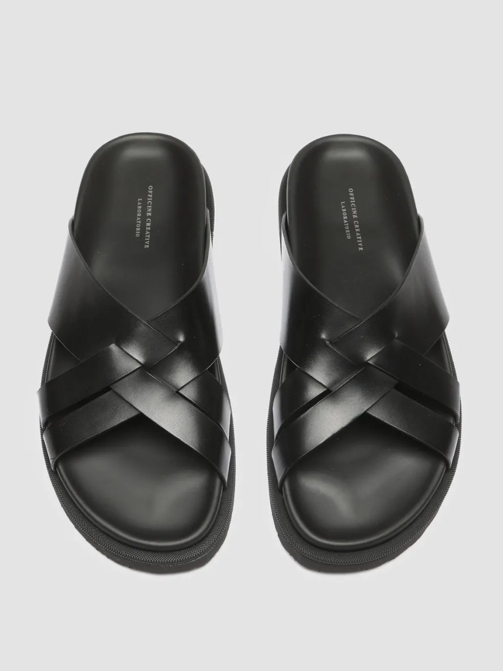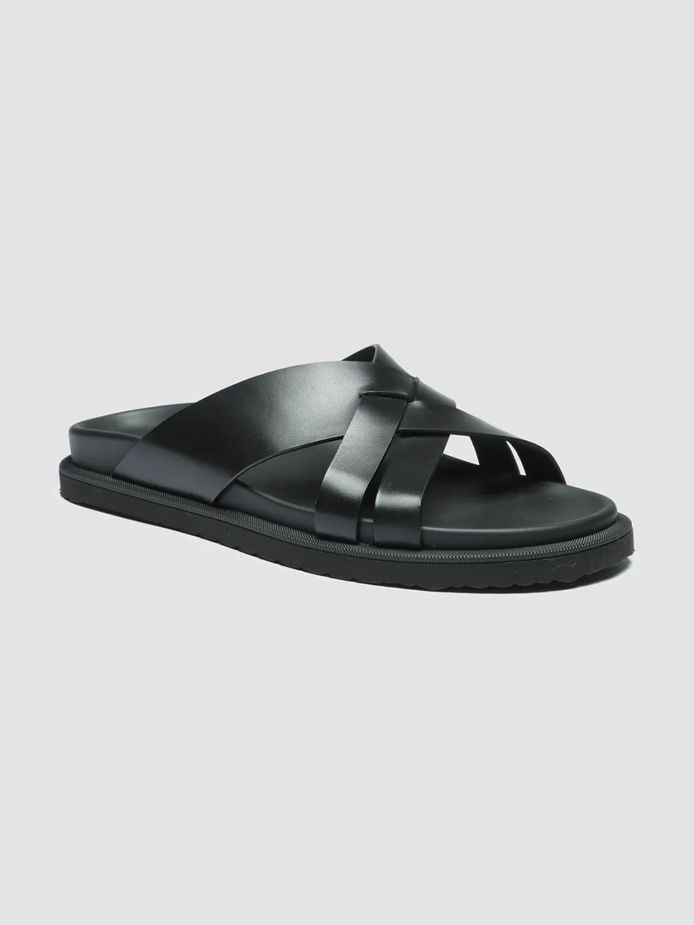 Easy to combine and wear, our Charrat slides are handcrafted from fine black smooth leather. They reveal an elegantly crossed strap band, round toe, molded insole and a flat natural rubber sole with a non-slip bottom.