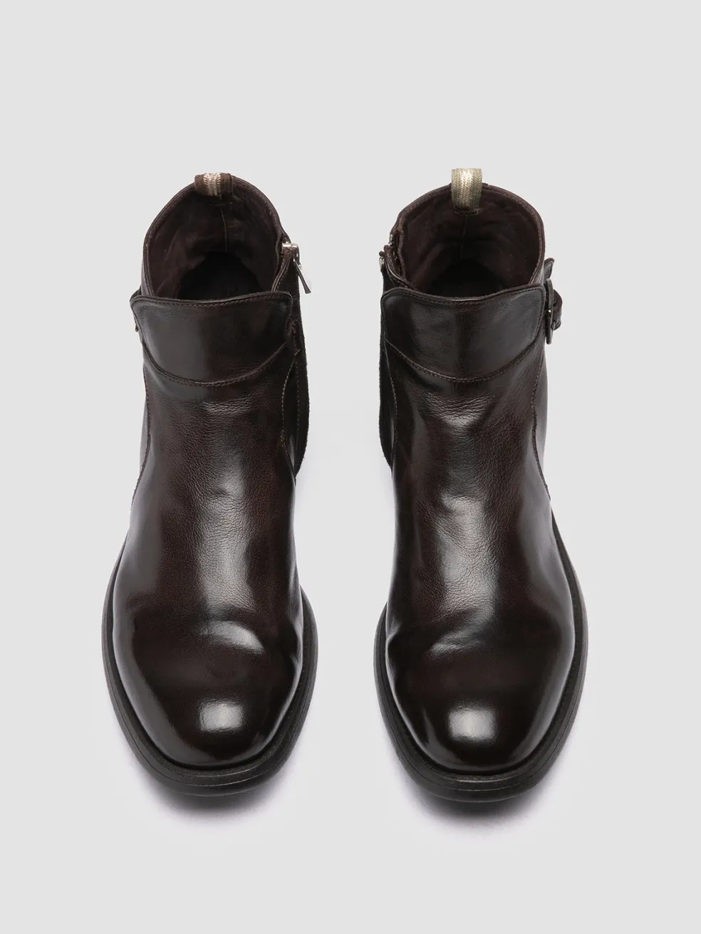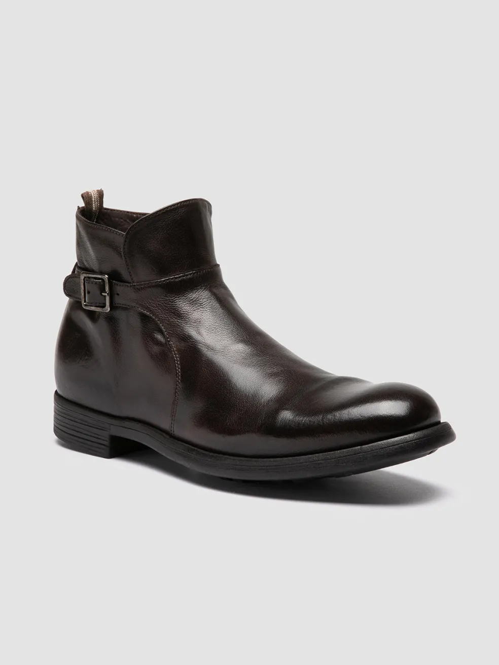 The Chronicle 068 boots are made in Italy from exquisite brown leather, featuring a sleek silhouette with a side buckle, a functional zippered closure, a natural rubber sole for durability and the signature grosgrain heel pull tab.