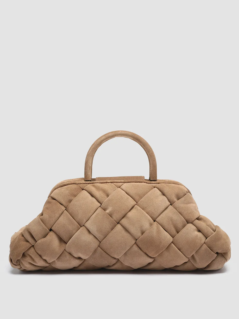 The Helen 21 Massive handle bag comes in sumptuous brown suede, intricately handwoven to create a textured, quilted appearance. This opulent model features sturdy top handles, a detachable shoulder strap and a fabric-lined interior with a magnetic closure.