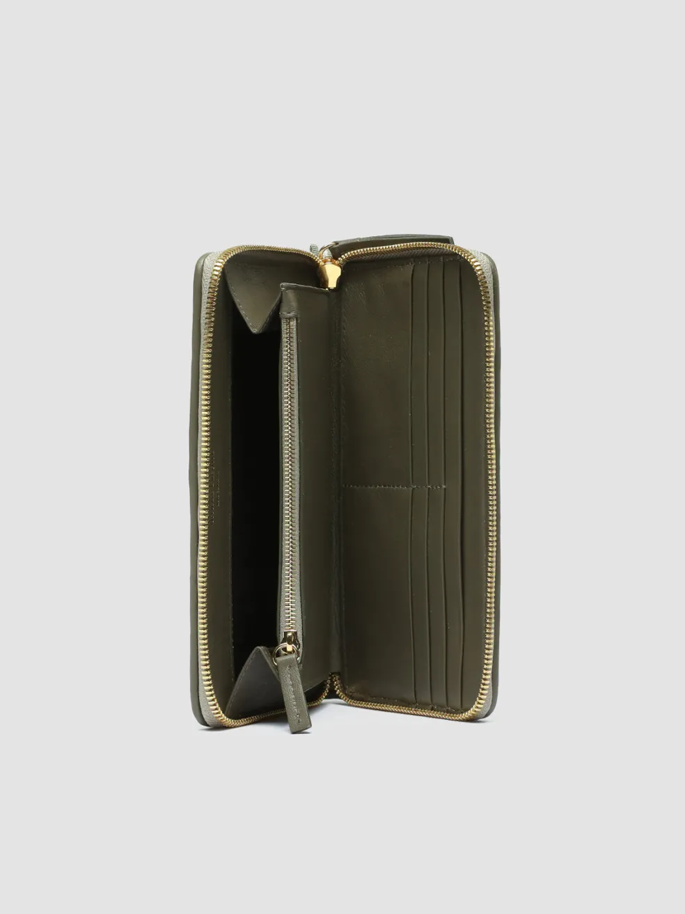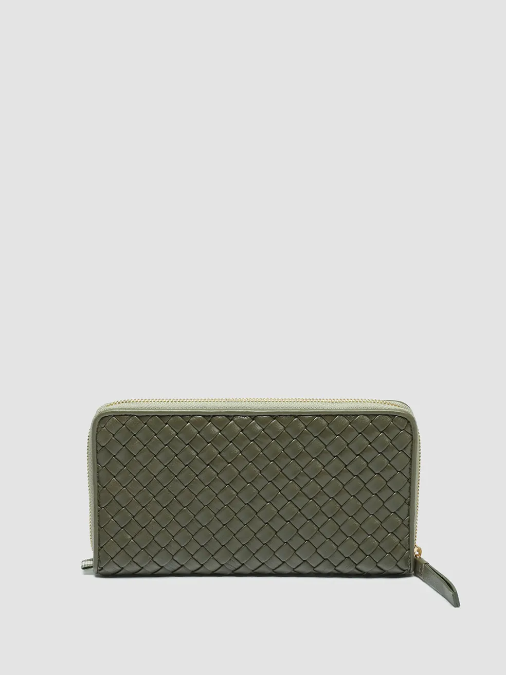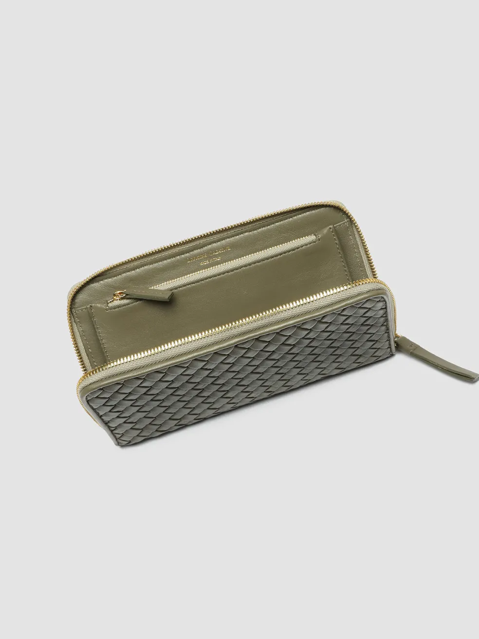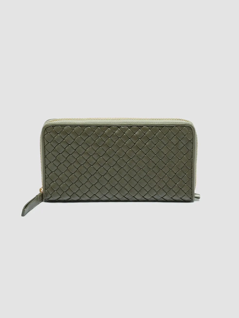 Great for organizing all your documents, our Juliet large wallet is handcrafted from premium green woven leather. It features a gold-tone metal zip around fastening, a zipped pocket, an open compartment and multiple card slots.