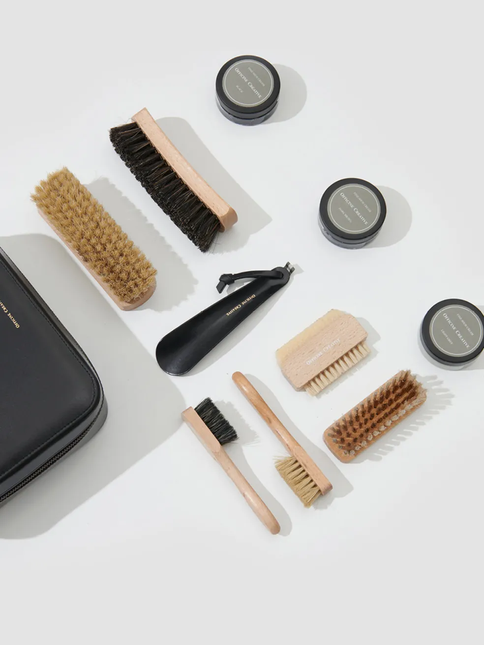 You need the right products to care for your shoes properly. Our exclusive kit includes all the essentials. Encased in sleek brown leather adorned with our gold-tone logo and sealed by a wraparound two-way zipper, it reveals our specific cream for leather care, multiple high-quality brushes for a thorough cleaning, a shoehorn, and a convenient flat zippered pocket.