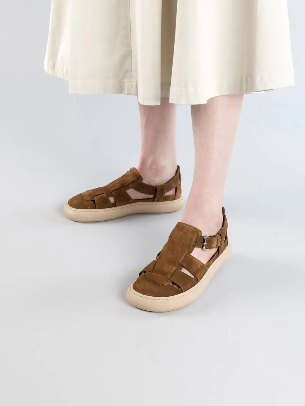 Handcrafted in Italy, the Dinghy 103 sandals in soft brown suede define casual comfort. The adjustable straps with elegant metallic buckles ensure a custom fit, while the chucky caoutchouc sole, both durable and natural, anchors the design, offering a contemporary twist on a relaxed silhouette.