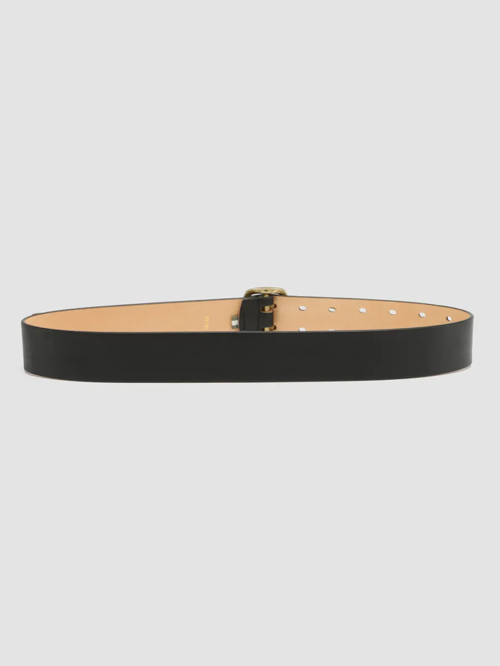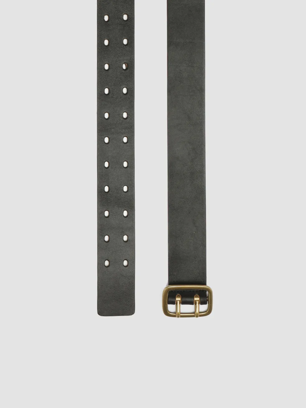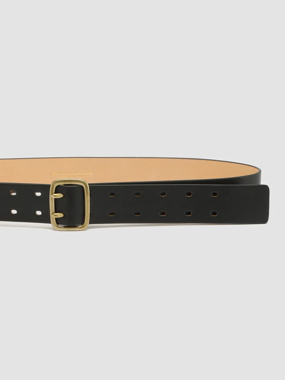 Our OC Strip belt is expertly handcrafted from premium black nappa leather and features a slightly rounded rectangular buckle in antiqued gold-tone metal, double row of holes and logo lettering embossed inside. Great to combine with nonchalant and modern looks.
