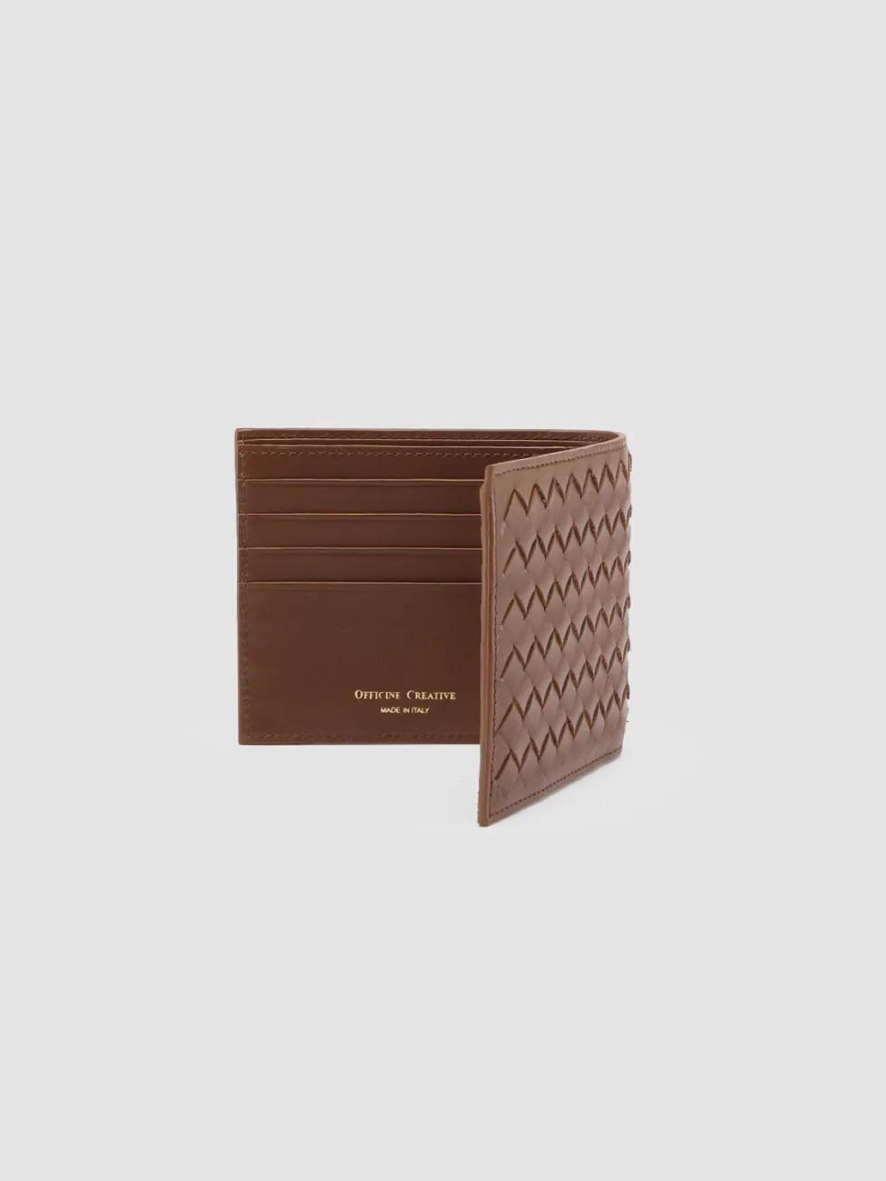 Our refined handcrafted Boudin brown leather bifold wallet is distinguished by a finely woven motif on the outside, while inside it reveals eight card slots, bill compartments and embossed gold-tone lettering logo.