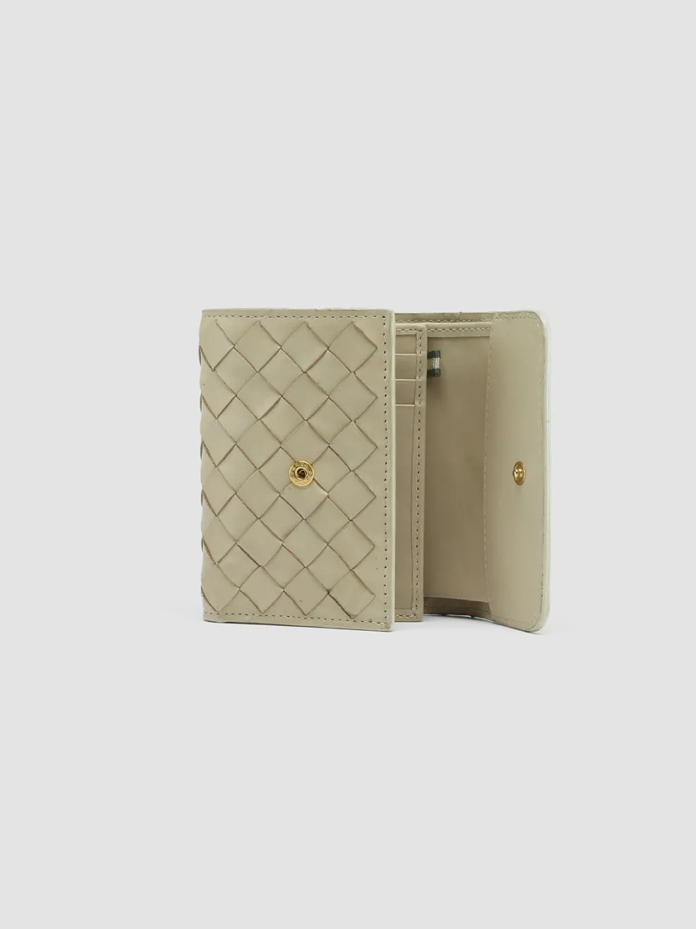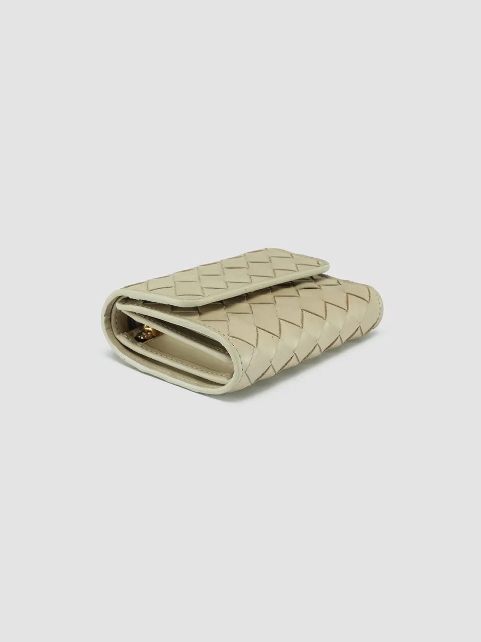 Compact and practical, our Poche trifold wallet is handcrafted from finely woven cream-tone leather. It reveals a snap button closure, multiple bill compartments and card slots, side zip pocket and gold-tone metal hardware.