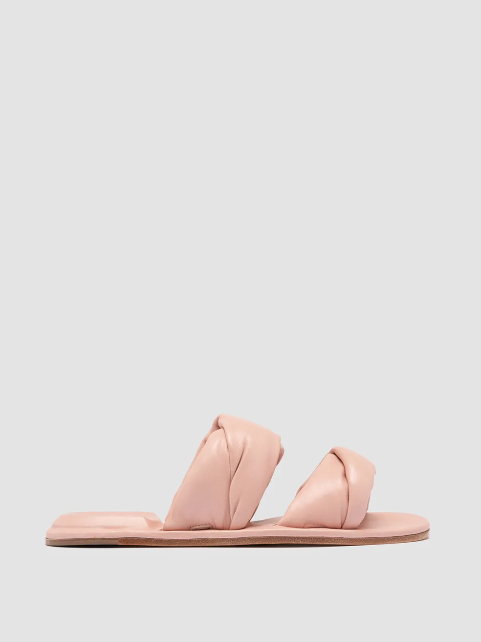 Our refined Cybille flat slides are embellished with original padded rose leather straps and by the signature low heel applied at the insole. Made with care by our craftsmen they feature a rounded toe and a leather sole.