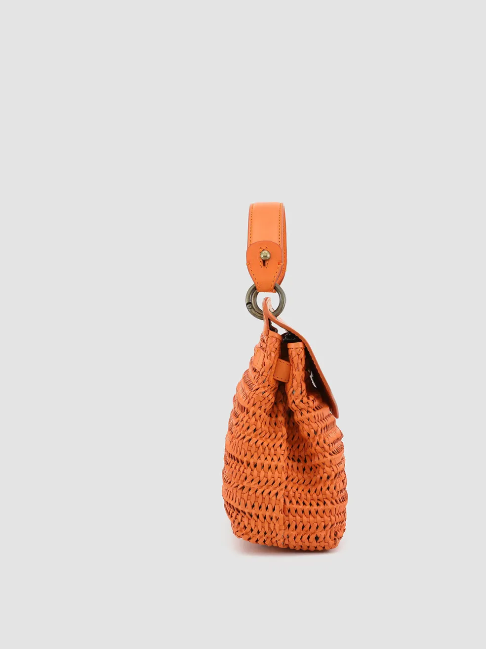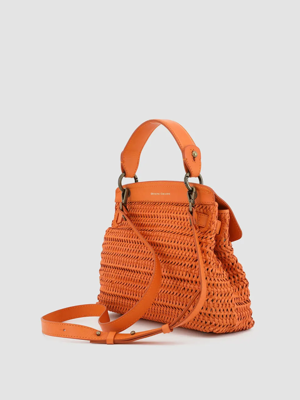 The Nolita 09 handle bag is made from premium orange leather. This model stands out for the intricately handwoven leather silhouette, featuring an accordion structure, antique-finish metal elements, a top handle and a removable strap.