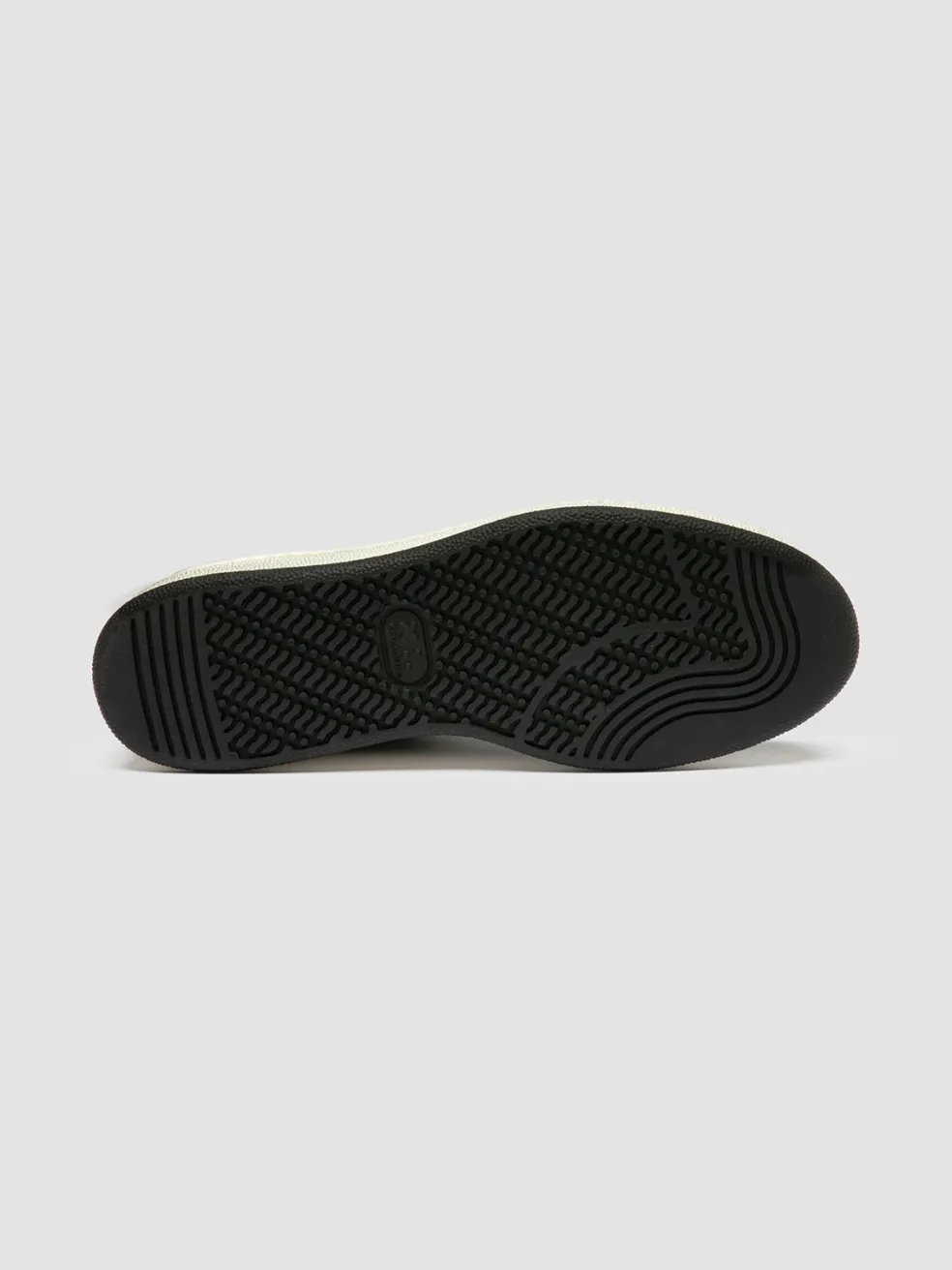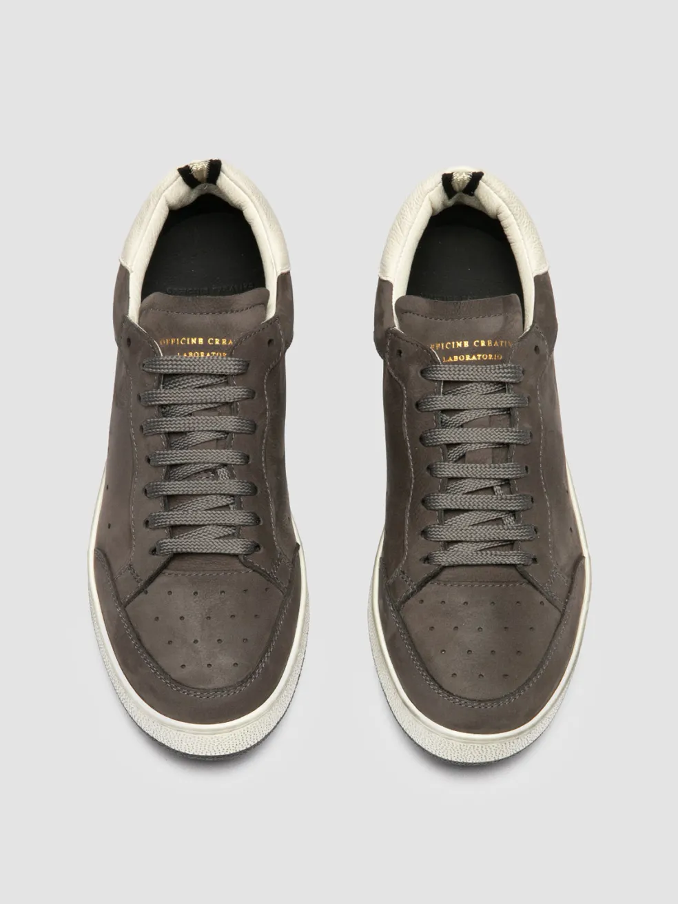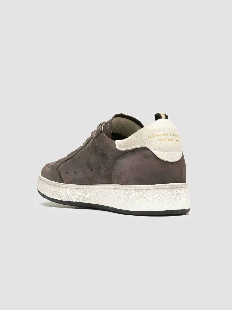 A nod to the taste of the OC clientele, the Answer 102 low top sneakers are handcrafted in Italy from nubuck leather. Extremely light, they feature an unlined grey silhouette with a white heel patch and a rubber sole.