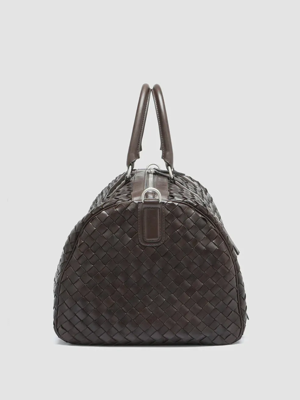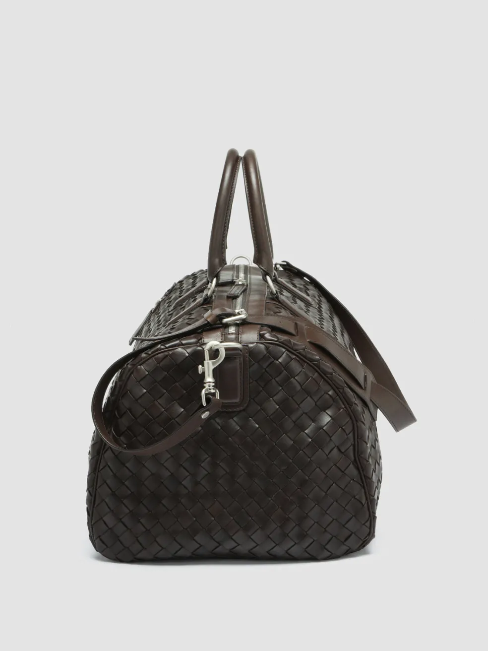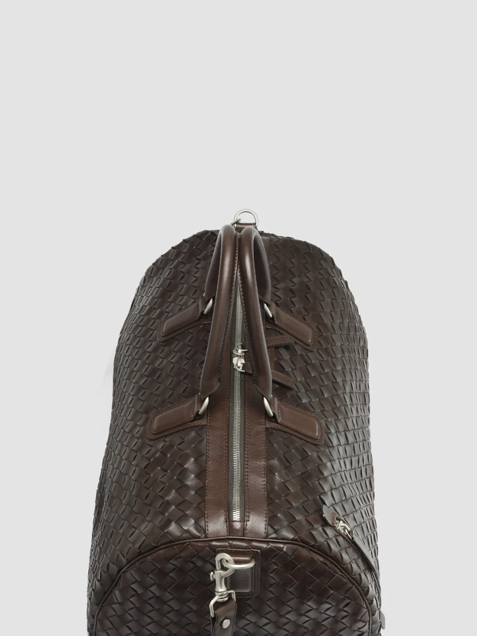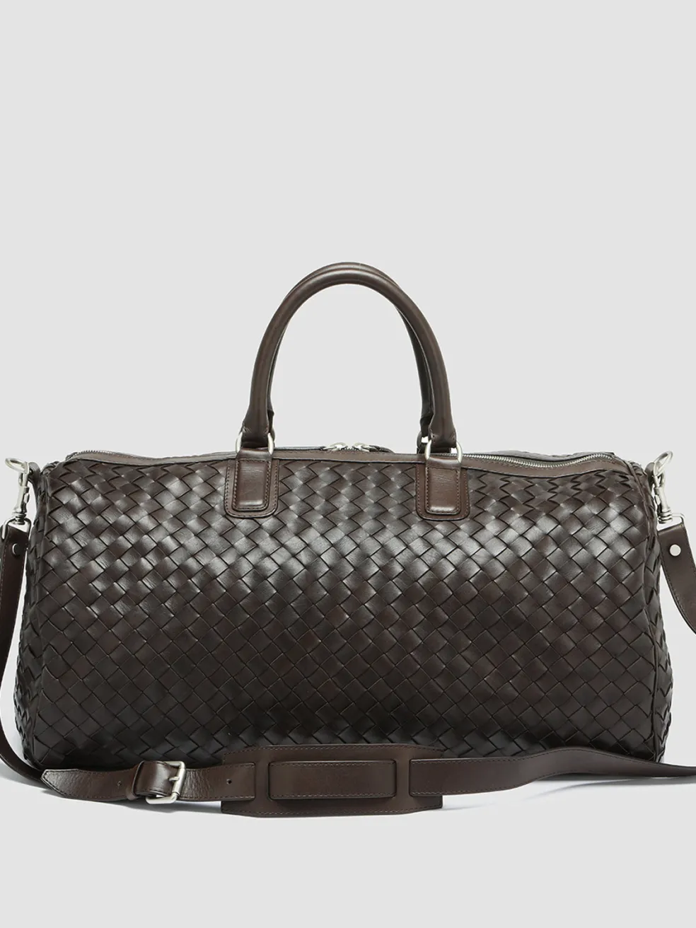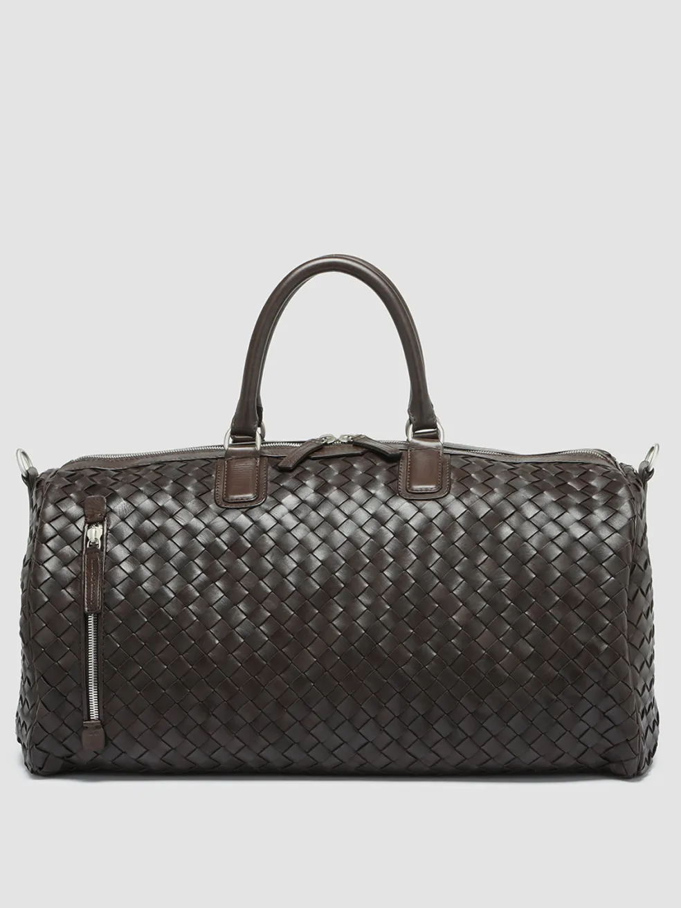 Our hand-woven leather Armor weekender features two top handles and an adjustable shoulder strap for easy carrying. The two-way zip in silver-tone metal that opens to reveal a spacious main compartment and the vertical front zip pocket make it the perfect bag for weekend getaways.