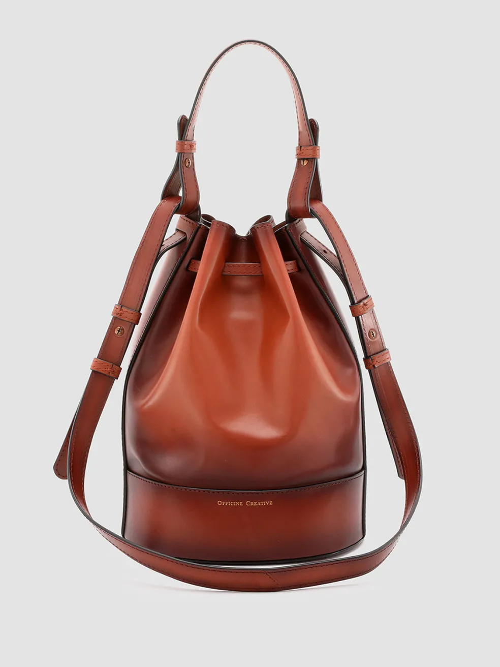 Our Saddle bucket bag in supple rhum-tone airbrushed leather catches the eye thanks to the versatile and refined design made with care by hand by our peerless artisans. It reveals a top handle and an adjustable and detachable strap to style it comfortably on the shoulder or as a crossbody drawstring fastening rounded and rigid bottom on which our lettering logo stands out and antiqued gold-tone metal hardware.
