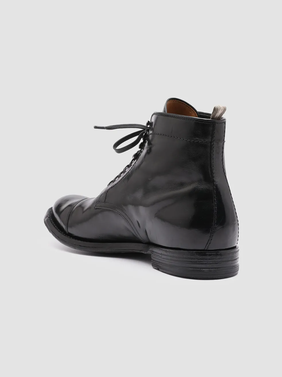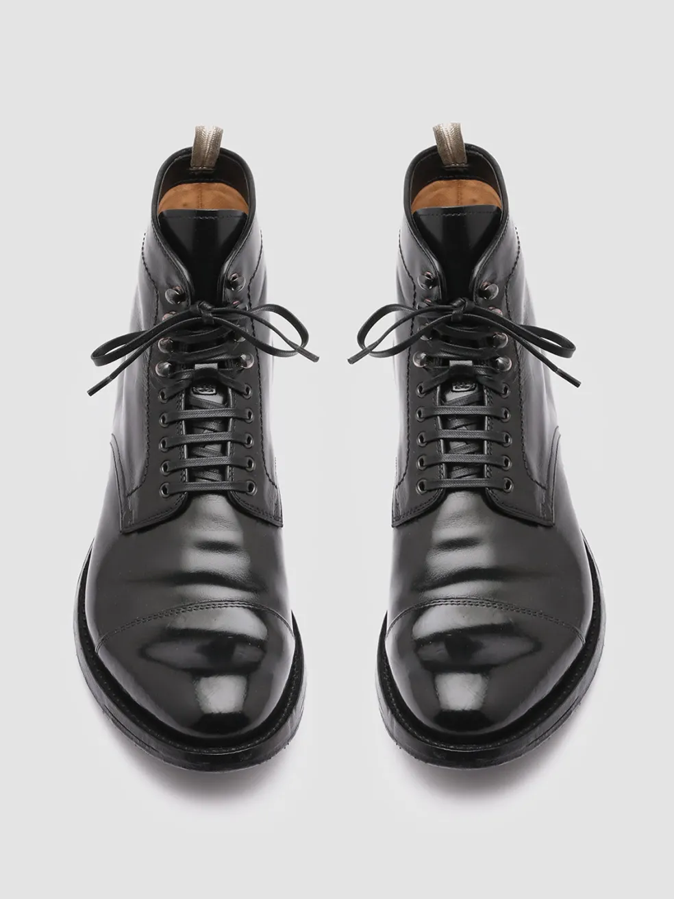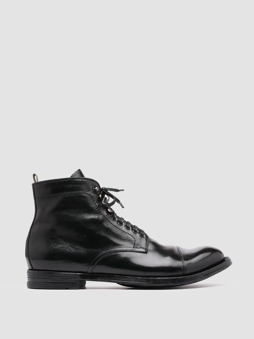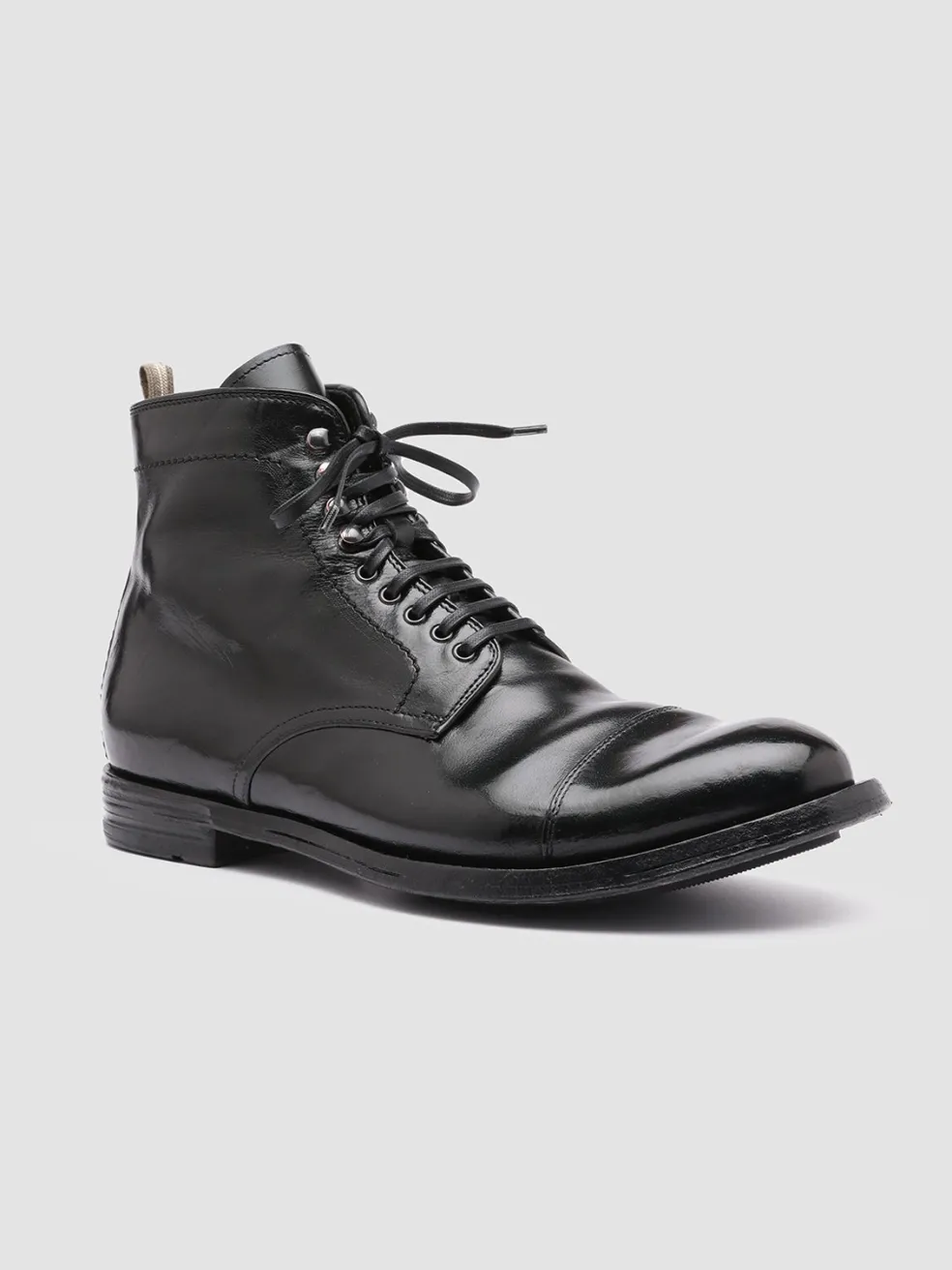 Versatile design and effortless style for our Anatomia handcrafted boots. Made from very soft black leather they have a comfortable silhouette with an almond toe front lace-up signature grosgrain heel pull tab and leather sole with low stacked heel and rubber details.