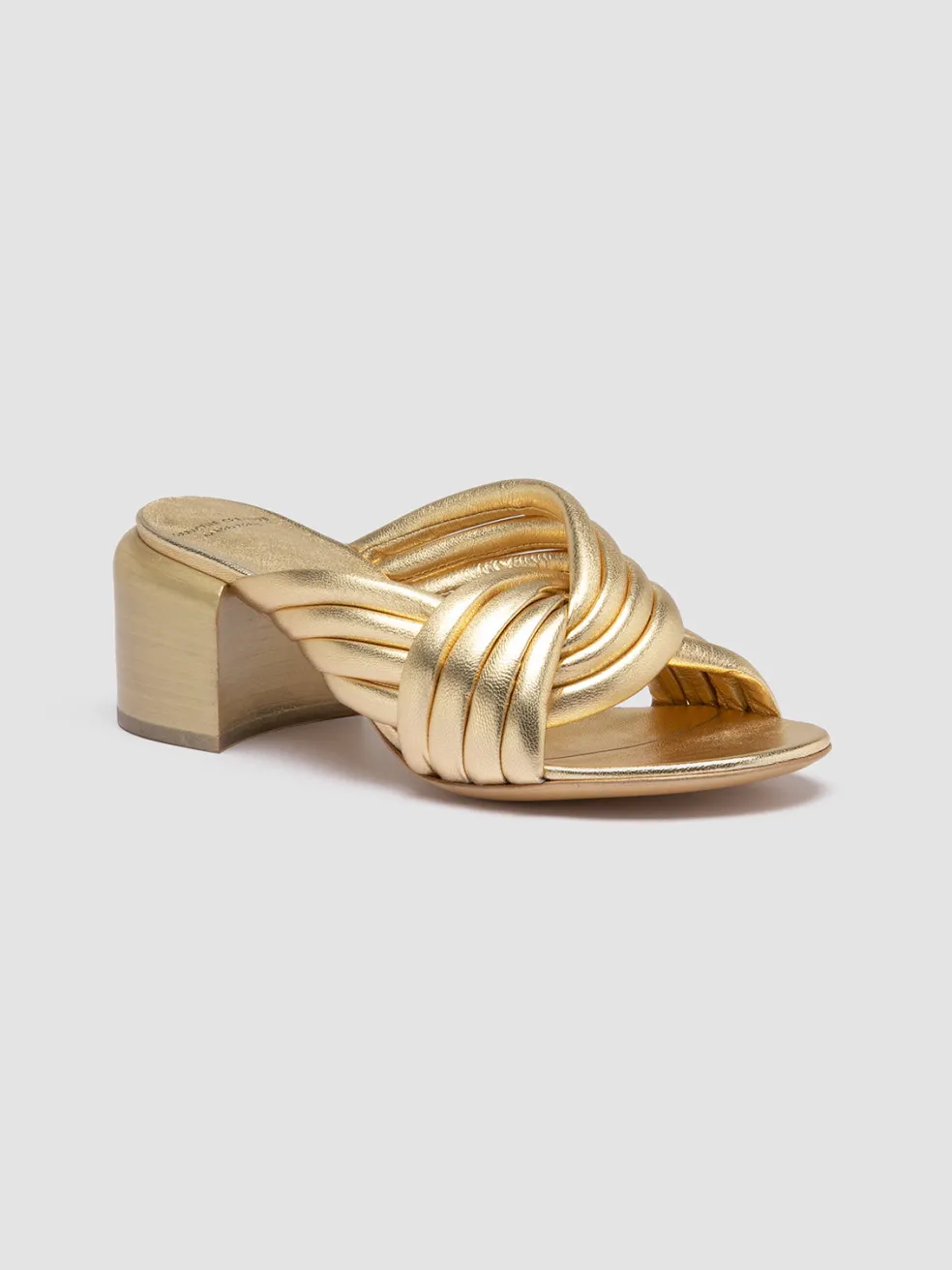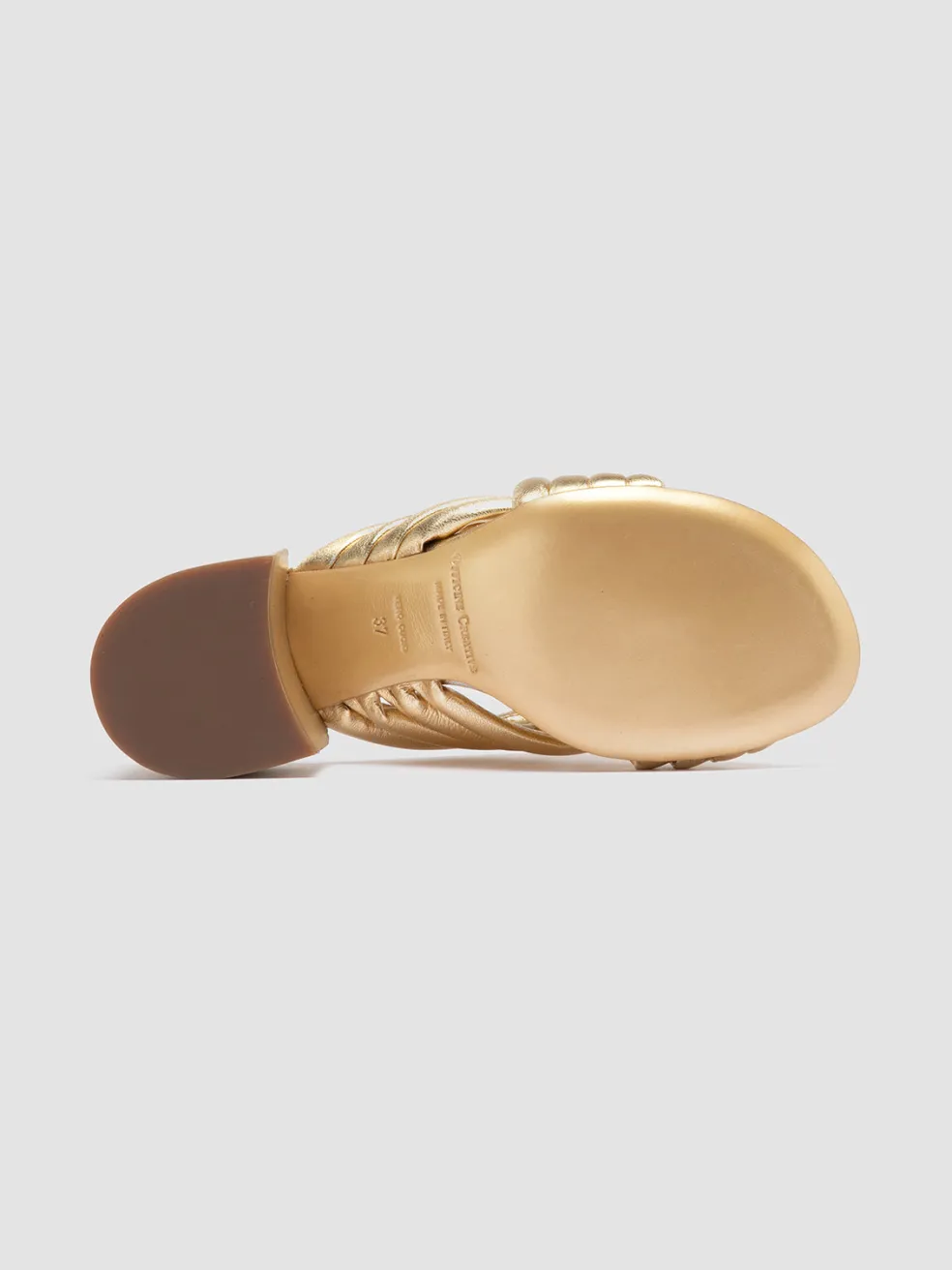 Radiate sophistication with the Ethel 022 gold sandals. Made in Italy with premium leather, the unique handwoven straps form an intricate embrace for the feet, harmonising with a sculpted block heel, for a glamorous yet comfortable look. Perfect for enhancing any outfit with a golden touch.