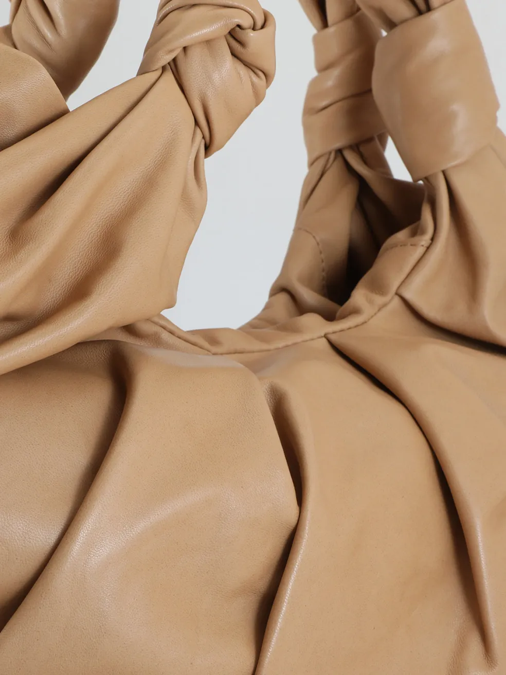 A sophisticated and timeless style marks our super soft BOLINA bag in fine smooth tan leather. Handcrafted by our skilled artisans it features a rounded silhouette enriched by pleats at the sides decorative BOLINA at the two upper handles and a concealed magnetic fastening.