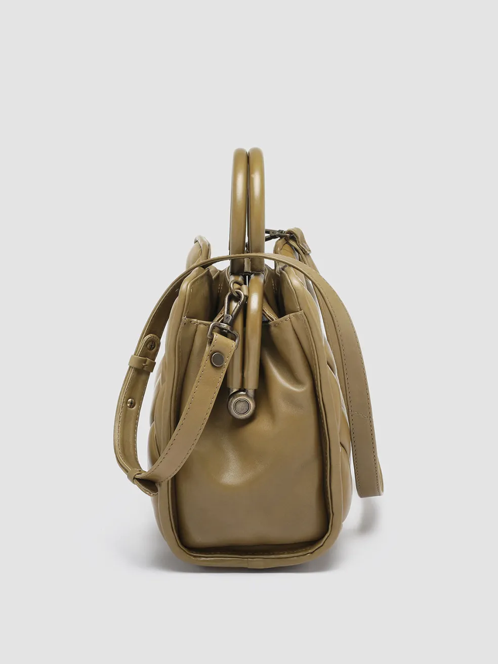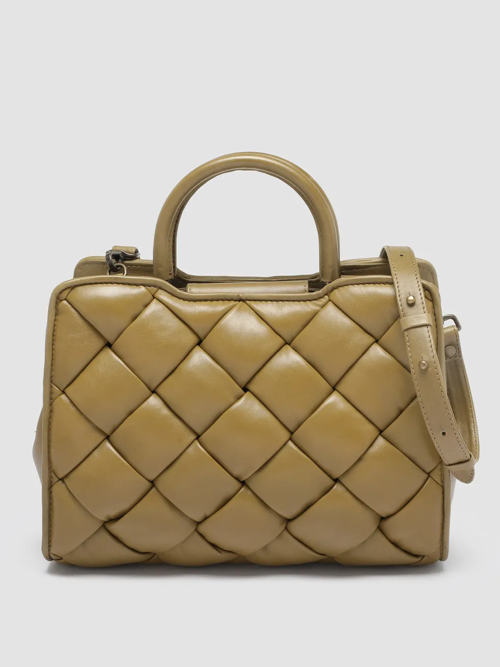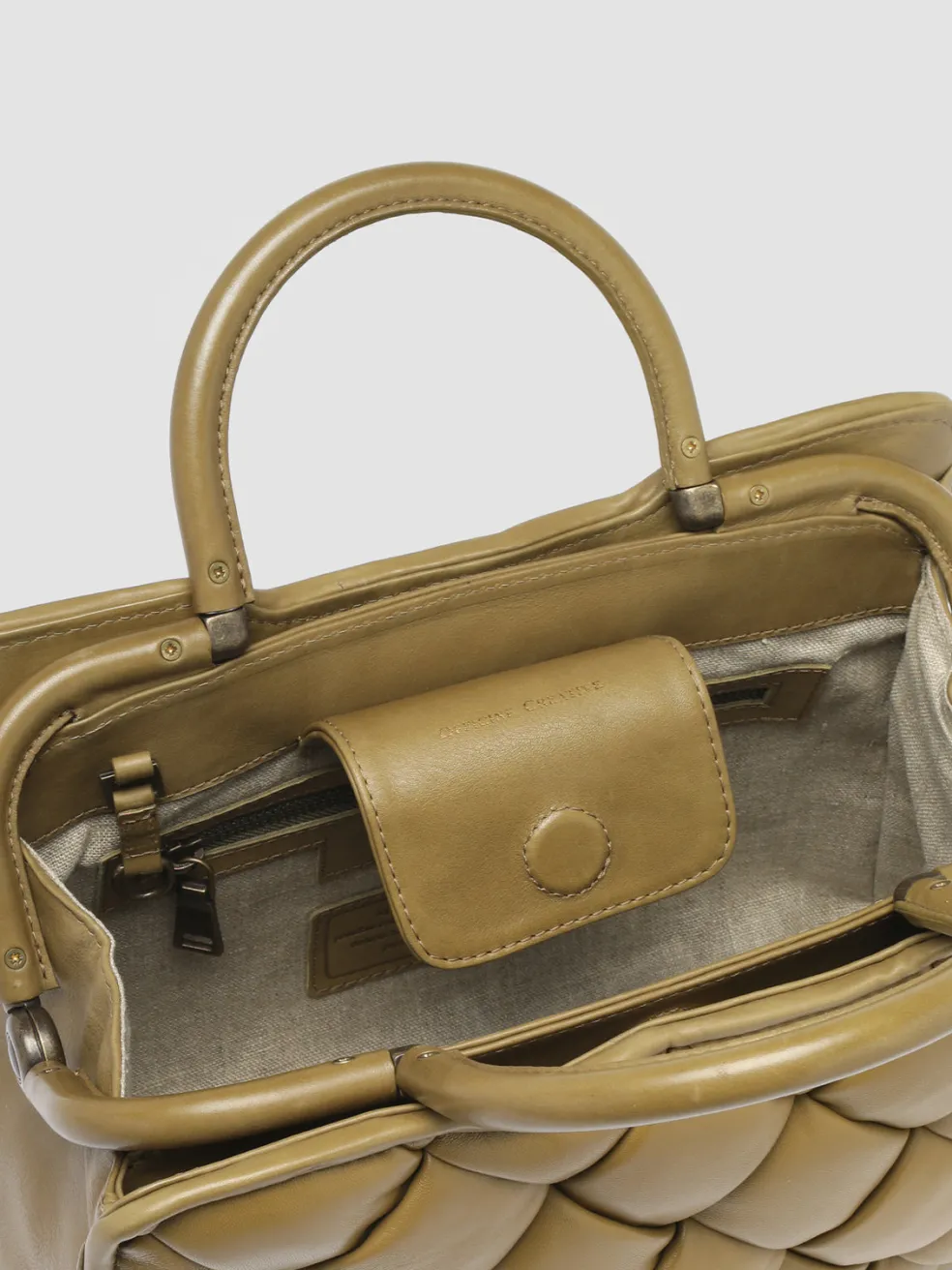 Handcrafted from the highest quality khaki woven leather our Helen bag reveals an elegant and timeless design. With two top handles in smooth leather and an adjustable and detachable shoulder strap, it can be worn, in hand, on the shoulder or as a crossbody. The fabric lined interior features a snap closure, internal leather panel with magnetic button, an inner zip pocket and antiqued gold-tone metal hardware.