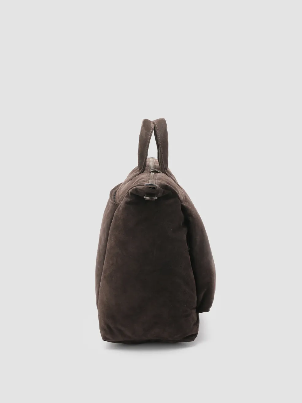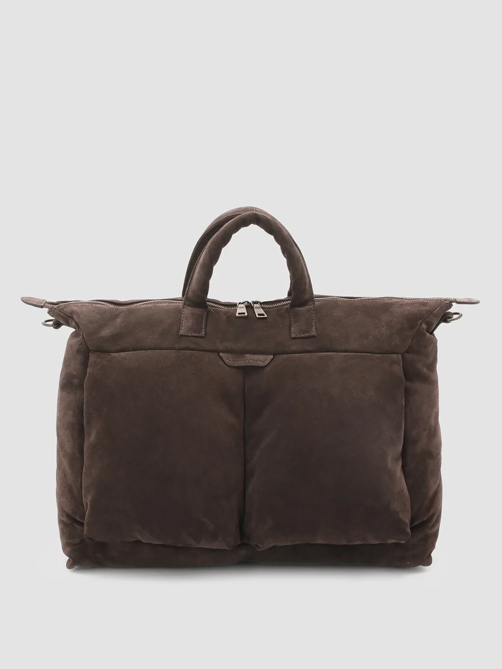 Our Helmet handcrafted bag features a roomy and practical silhouette that is decidedly unique. It is made by our peerless artisans from fine brown airbrushed smooth suede and features two padded leather top handles, two-way zipped main compartment, two front pockets with concealed side zip, leather tab with embossed lettering logo, adjustable and detachable shoulder strap, back zip pocket, suede lining with two inner pockets one of which zips, and antiqued gold-tone metal hardware.
