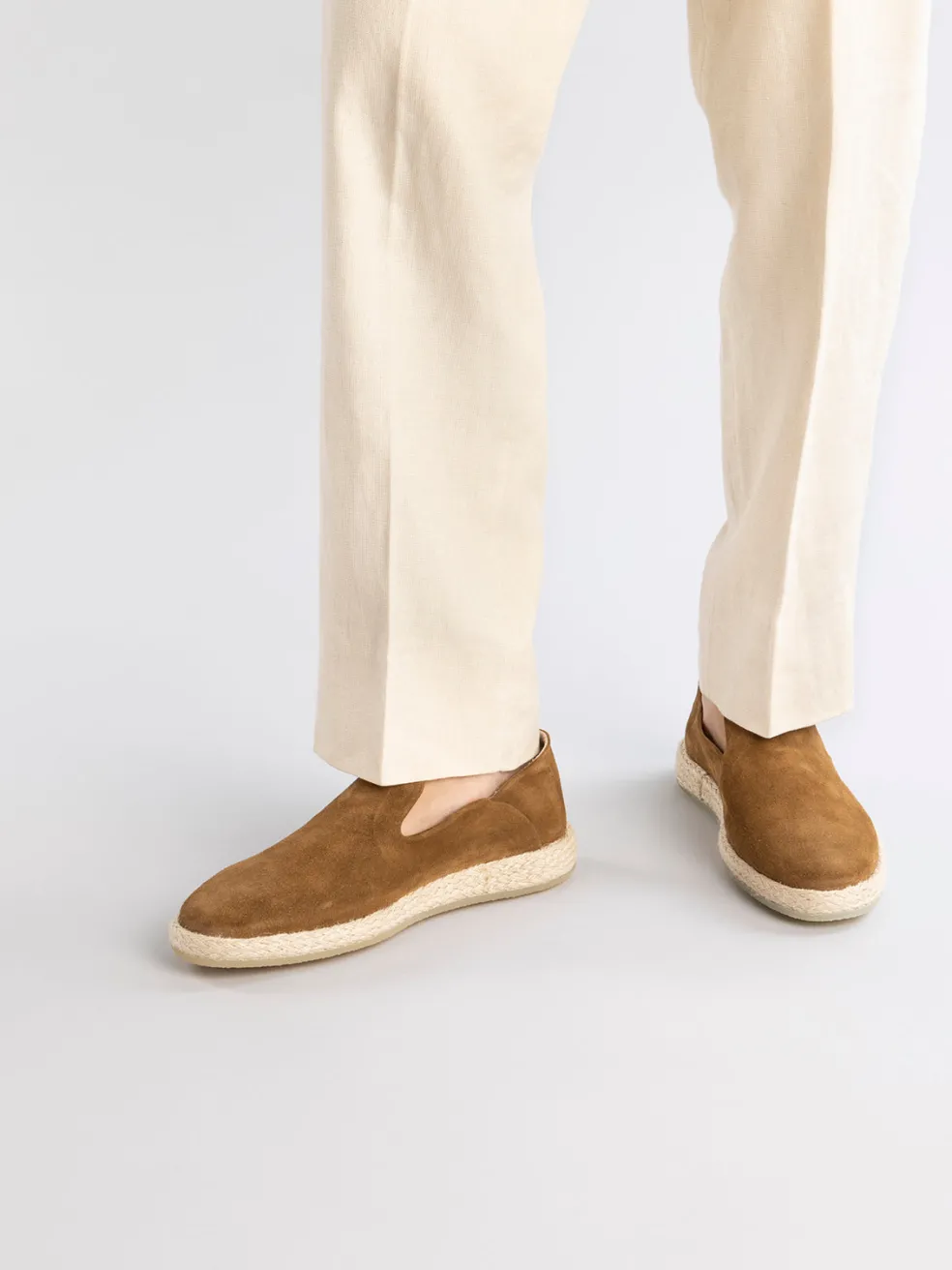 Our comfortable Roped slip ons can also be worn as slippers thanks to the foldable back panel. They are handcrafted from brown plush suede and feature a rounded toe design signature grosgrain heel loop and a woven raffia sole and crepe rubber outsole.