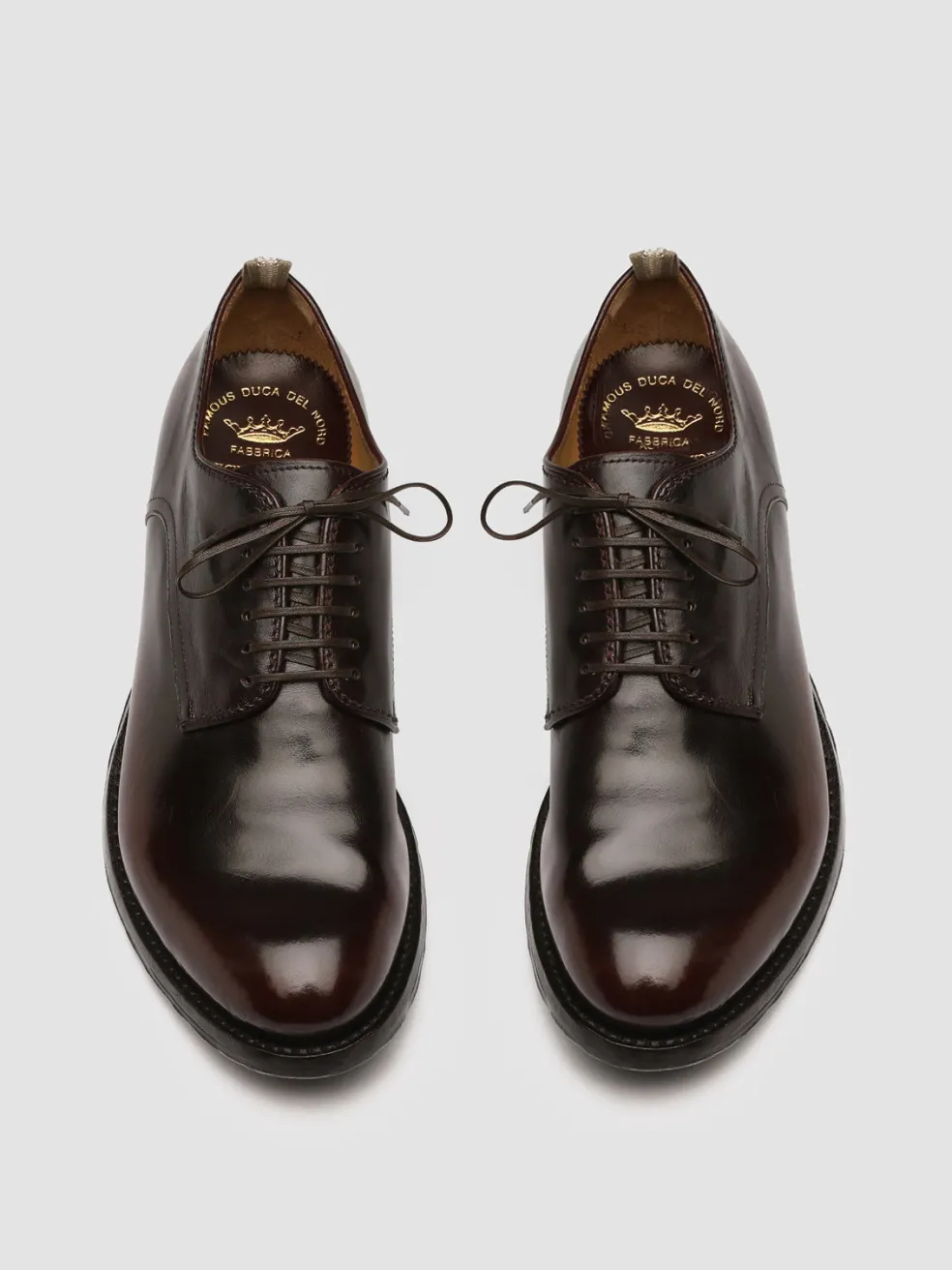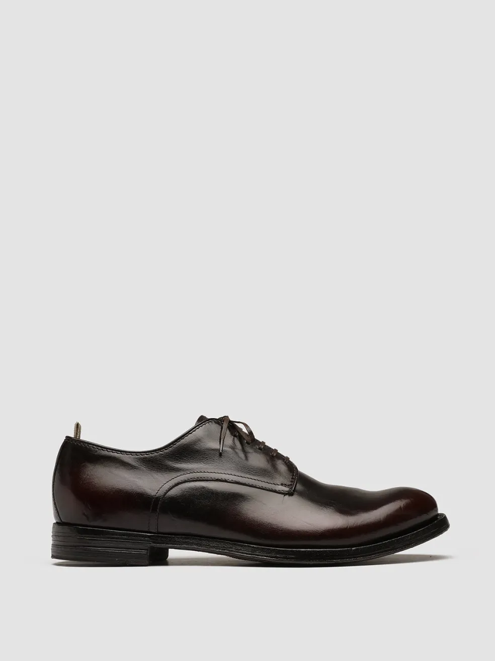 Our signature artisan Anatomia derby shoes come in a new refined version in shades of burgundy and dark brown. They are expertly handcrafted by our artisans from fine smooth leather and reveal a rounded almond toe thin waxed laces distinctive grosgrain heel pull tab and a leather sole with rubber outsole and stacked heel.