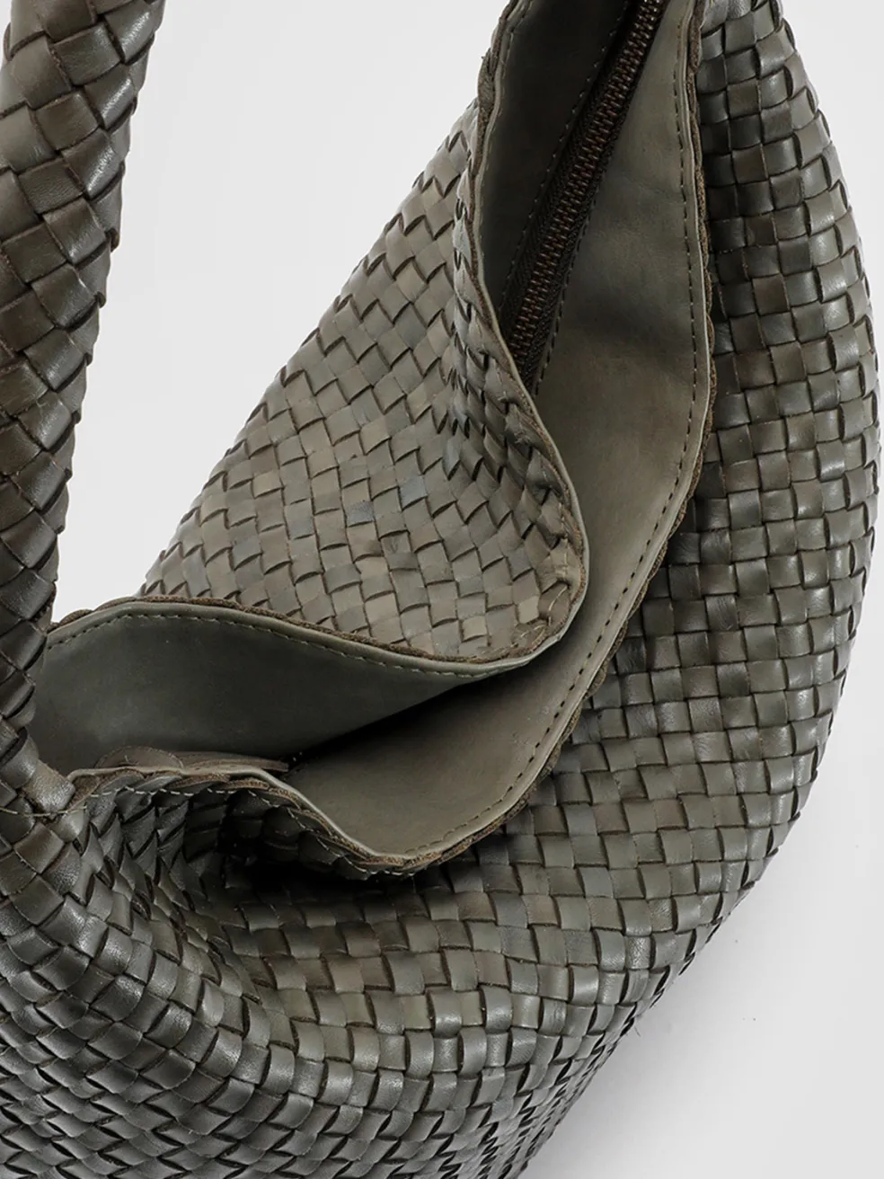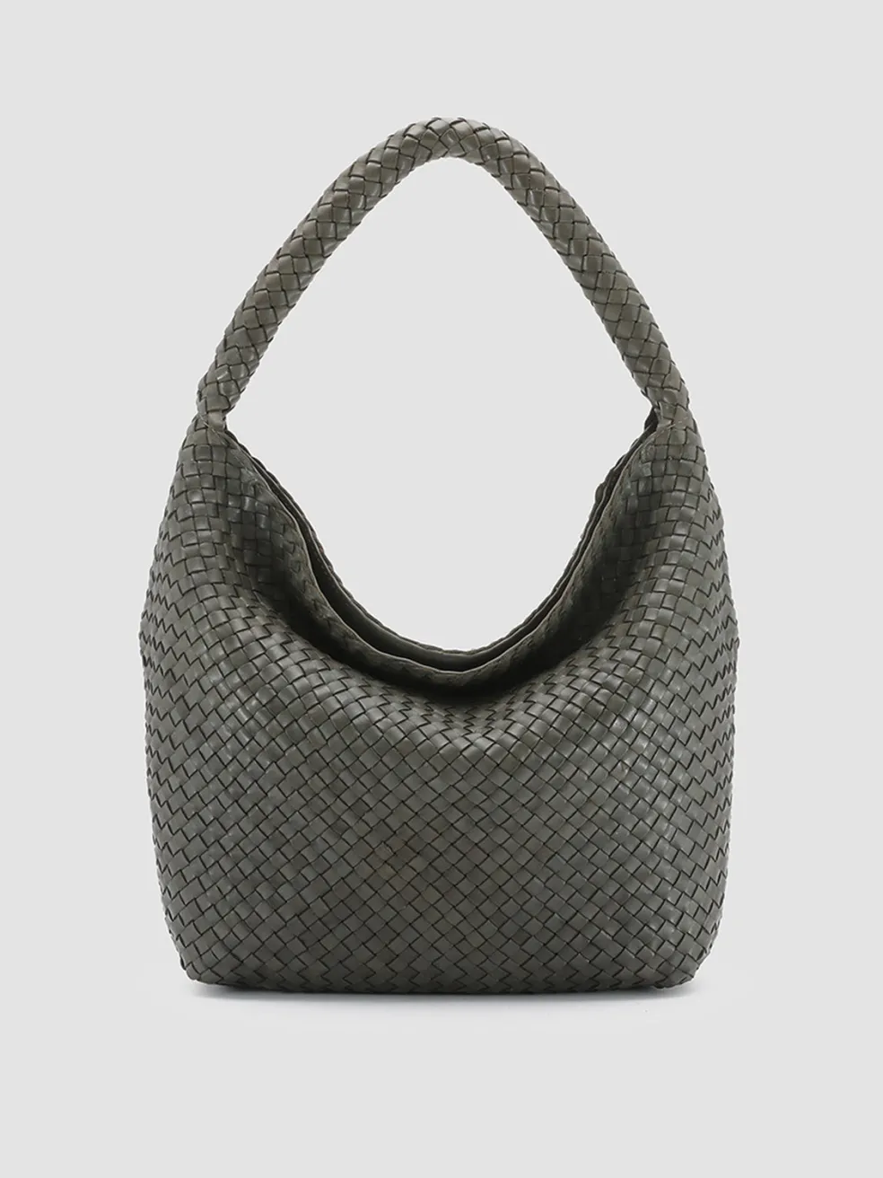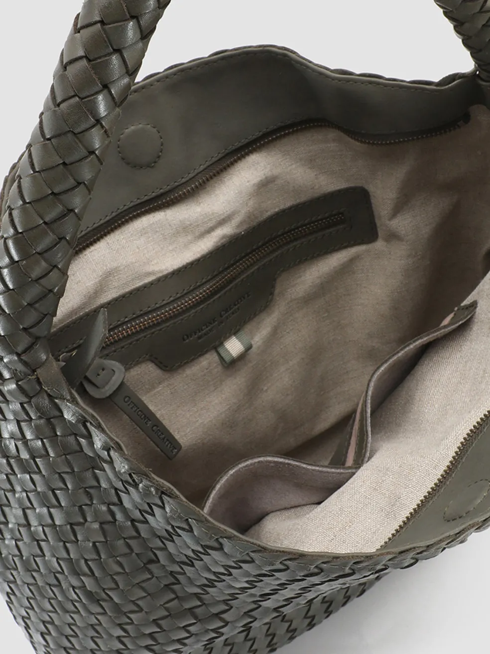 Versatile and refined our OC Class bag features a soft and roomy design in fine dark green woven leather. It is expertly handcrafted by our artisans and reveals a top handle to carry it comfortably at the shoulder concealed magnetic fastening and zip fabric lining and three internal pockets one of which is closed by zip.