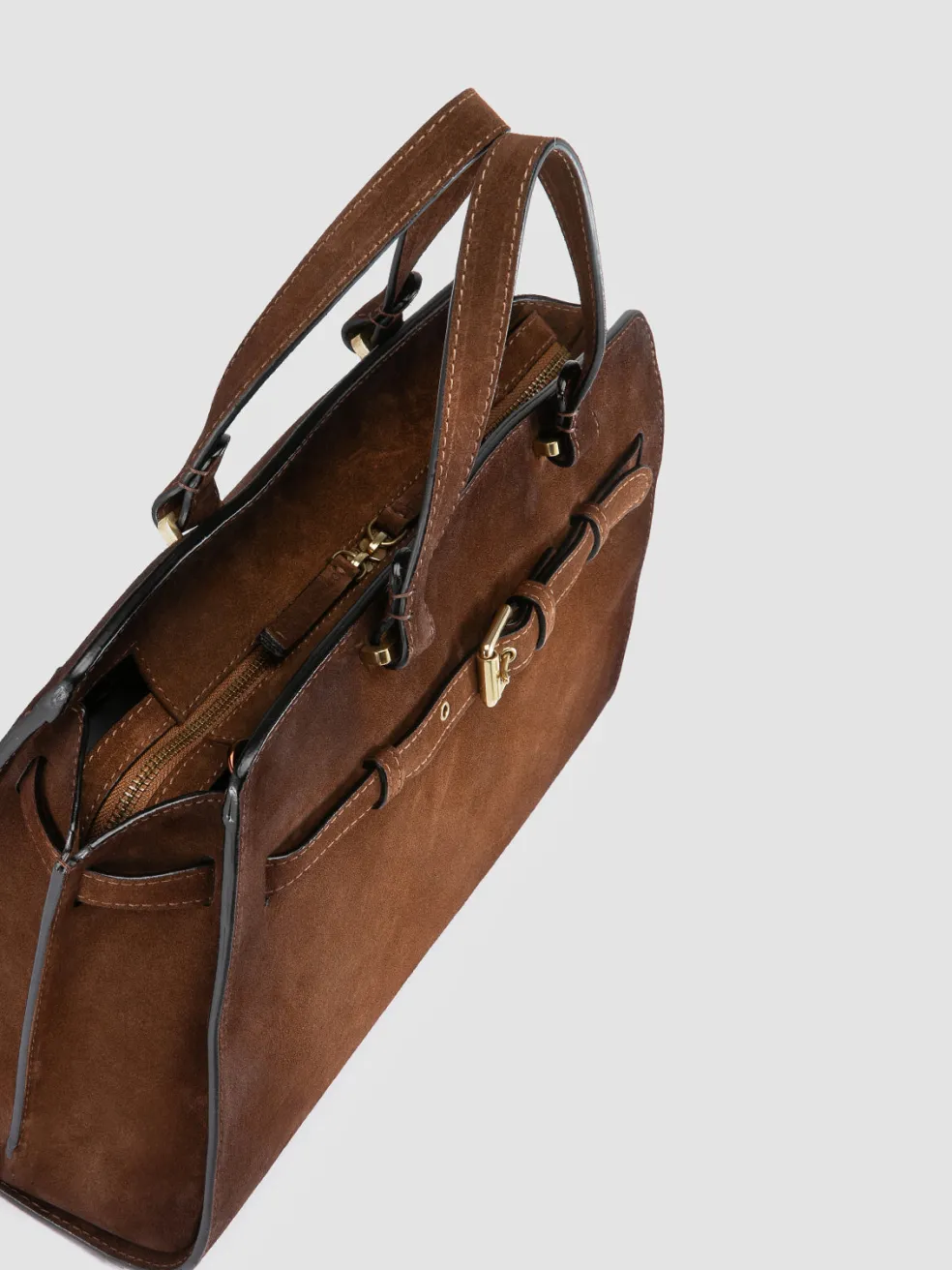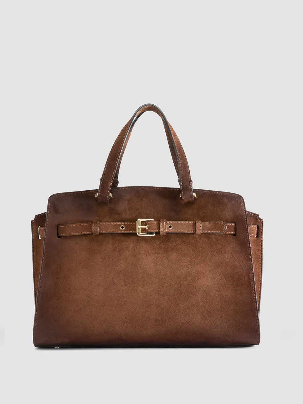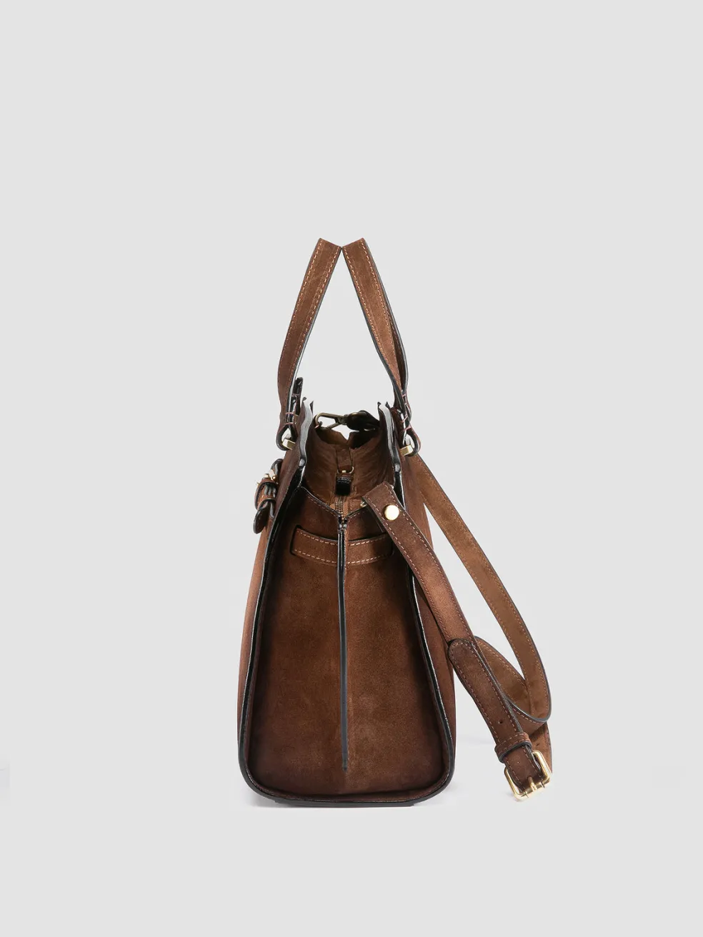 The Saddle 020 handbag showcases the timeless elegance of airbrushed suede, rendered in a warm brown hue. Handmade in Italy, it features a top handle, polished gold-tone hardware and a detachable shoulder strap.