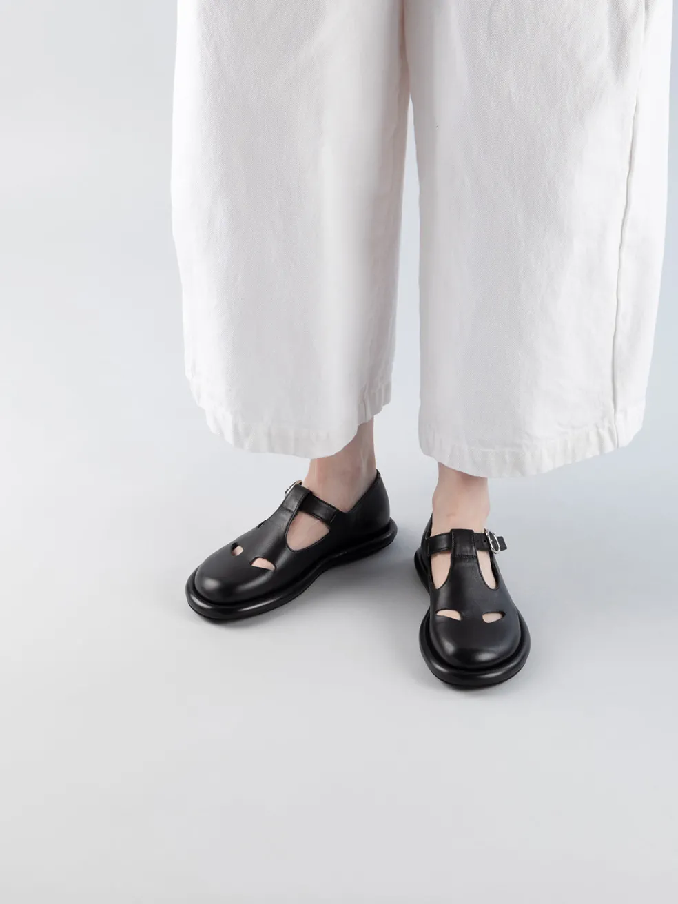 Handcrafted in Italy, the Estens 106 black T-bar shoes exude timeless elegance. The upper, with a minimal design with two holes and a strap closure with a metal buckle, sits on an extra-light EVA sole offering an exceptional sense of comfort. Perfect for those seeking freedom of movement without compromises.