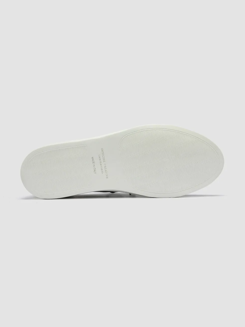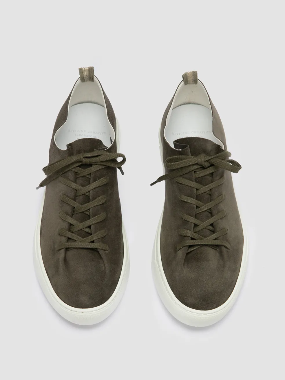 The Leggera 001 defines lightness and elegance in sneaker form. This model with an ultra-minimalist exterior hides a flexible and soft framework handcrafted in Italy from a single piece of seamless, unlined green suede that folds onto itself to form the shoe tongue. An almost weightless experience.