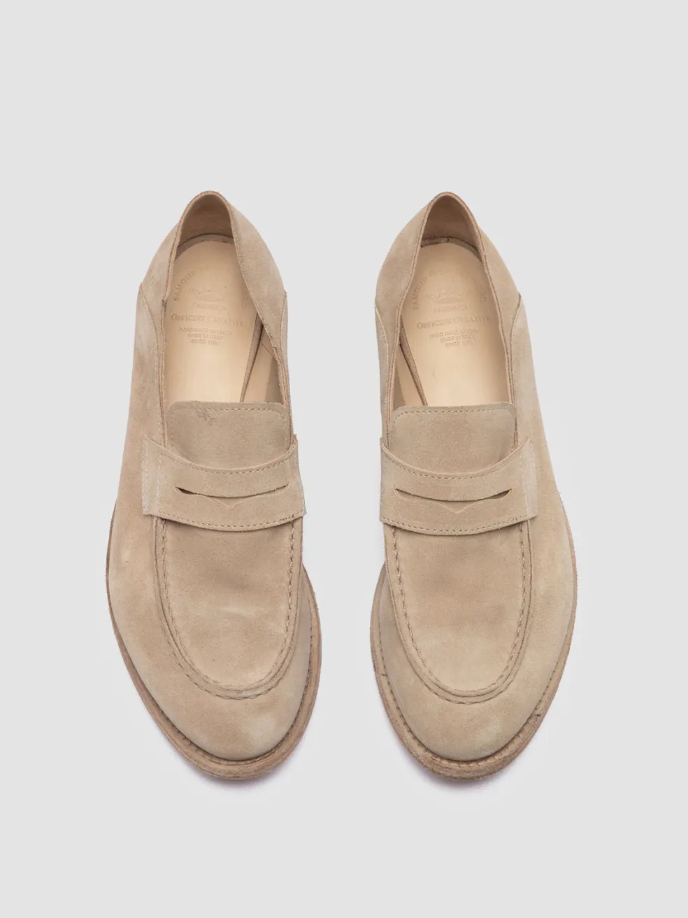Lexikon penny suede show a timeless and decidedly sophisticated style. They are crafted from fine ivory piece-dyed leather soft and comfortable thanks to the washed reverse finish that gives a suede effect. The hand-sewn stitching enhances their handcrafted quality while the leather sole with a squared stacked heel set out their design.