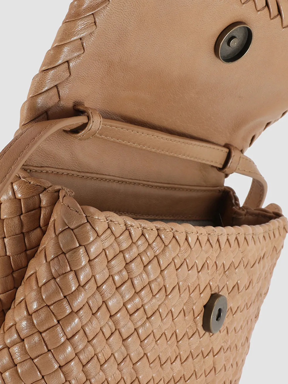 Our OC Class 47’s small rectangular silhouette in fine taupe woven nappa leather is perfect for everyday use. It is expertly handcrafted by our skilled craftsmen and with an adjustable and detachable smooth leather shoulder strap, concealed magnetic fastening, a flat pocket and a zipped pocket in fabric lining.