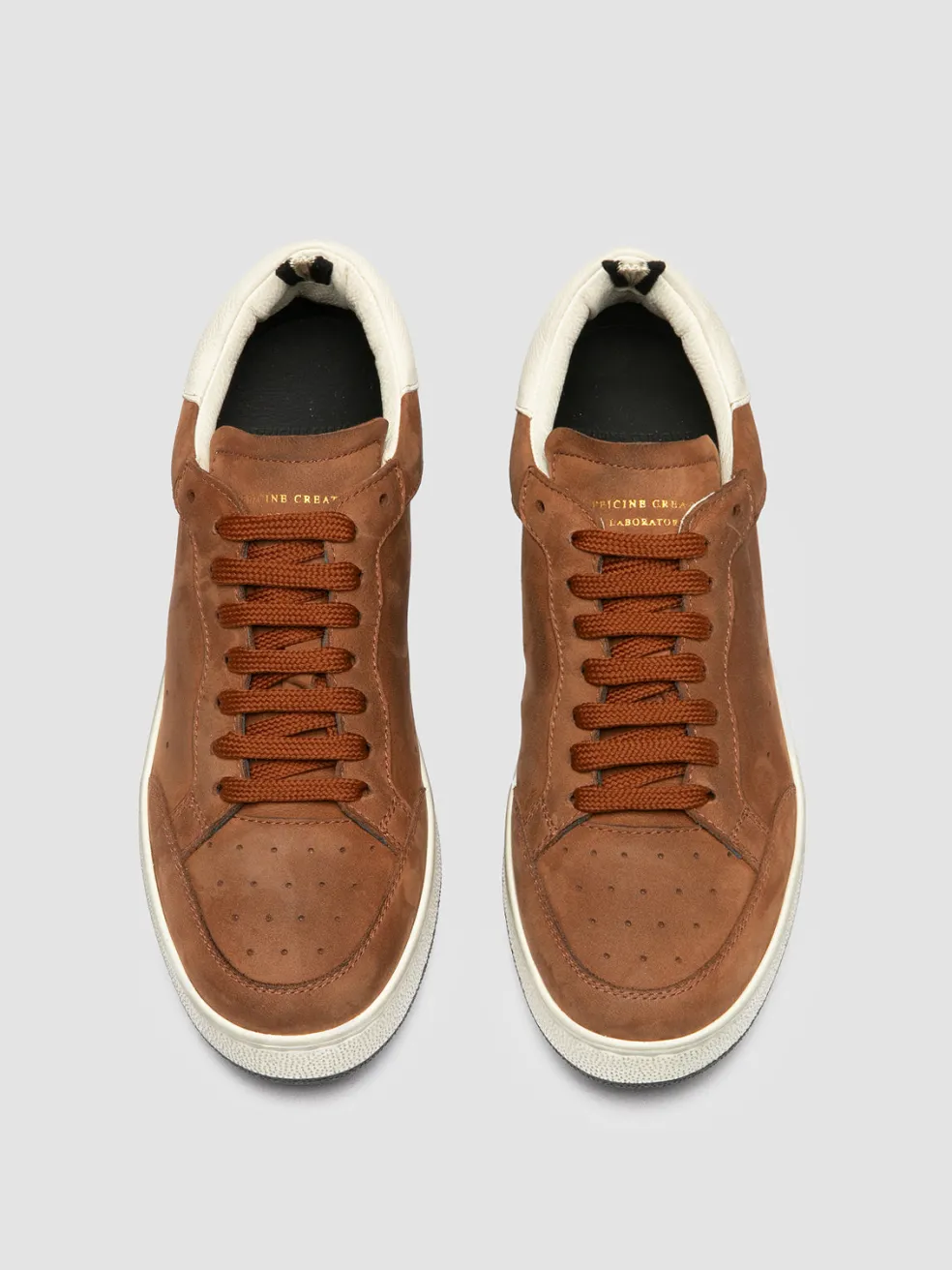 A nod to the taste of the OC clientele, the Answer 102 low top sneakers are handcrafted in Italy from nubuck leather. Extremely light, they feature an unlined brown silhouette with a white heel patch and a rubber sole.