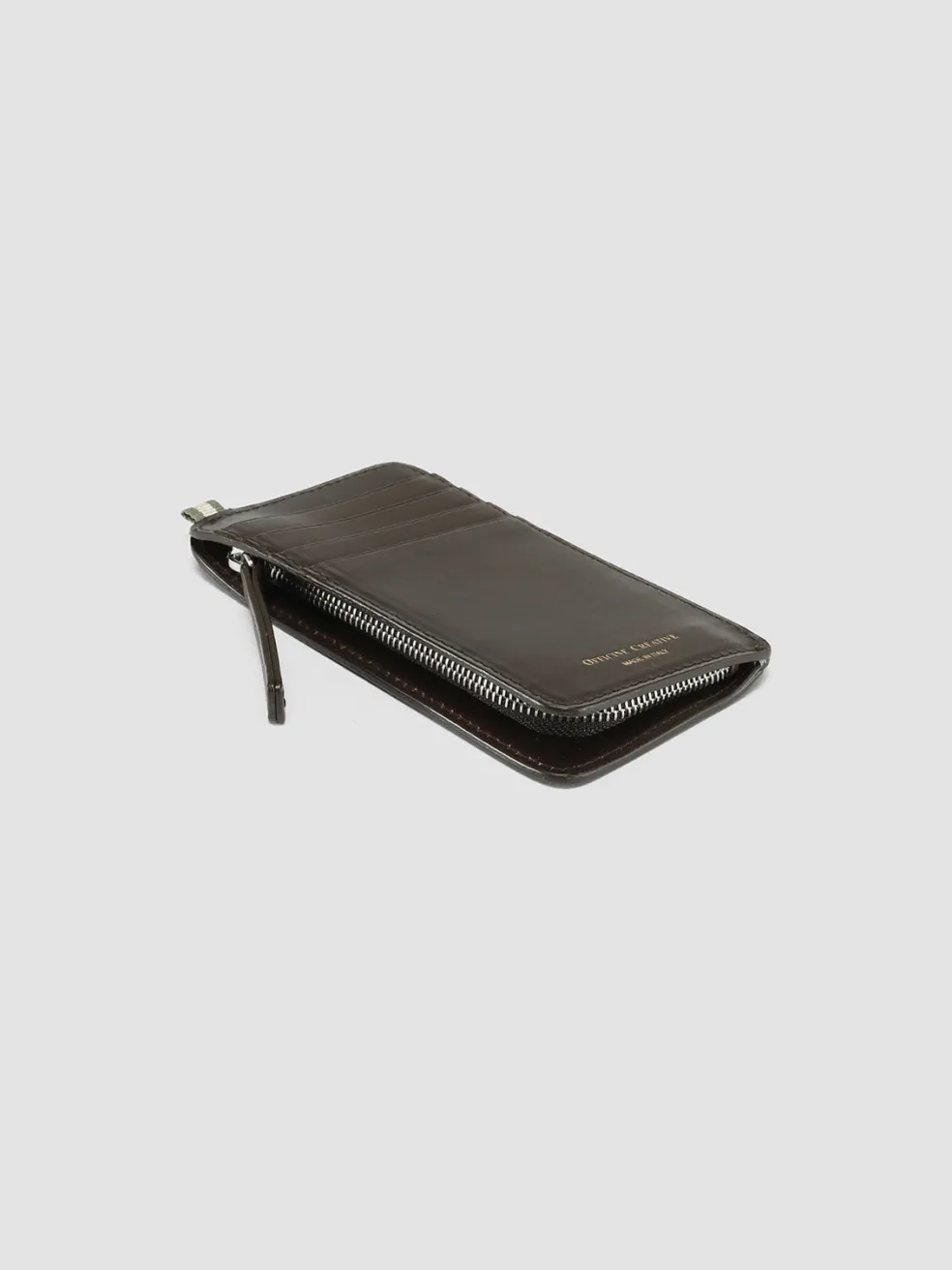 Our Bergè card holder is handcrafted from fine smooth leather in coffee tone. It reveals four card slots, embossed gold-tone lettering logo, signature grosgrain loop tab on the side and pocket with silver-one metal zip fastening.