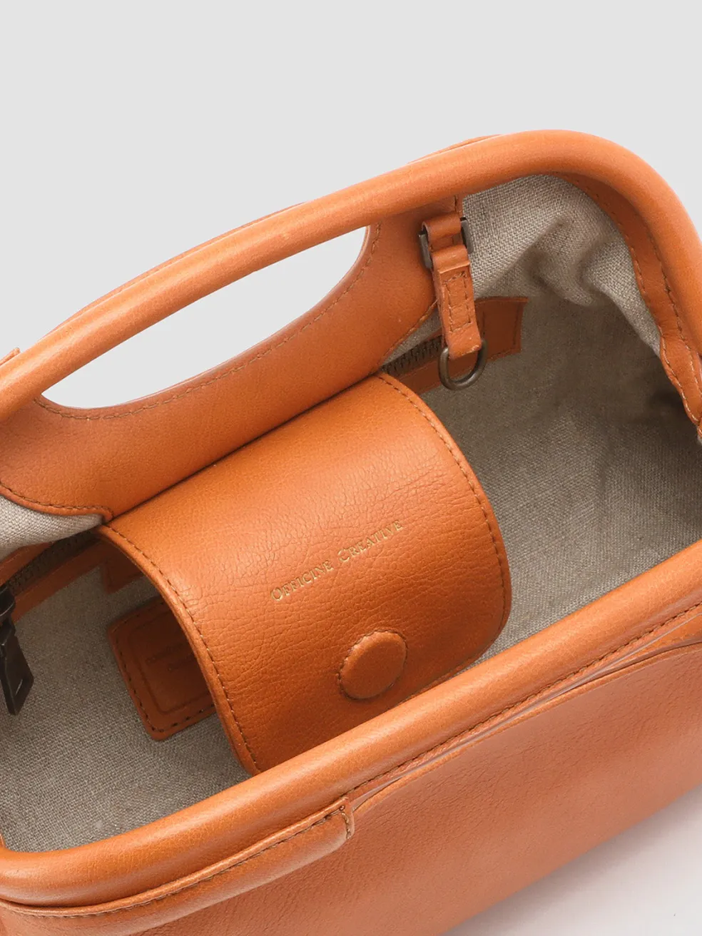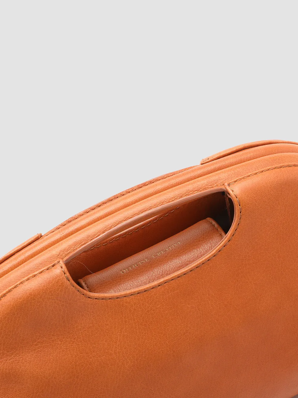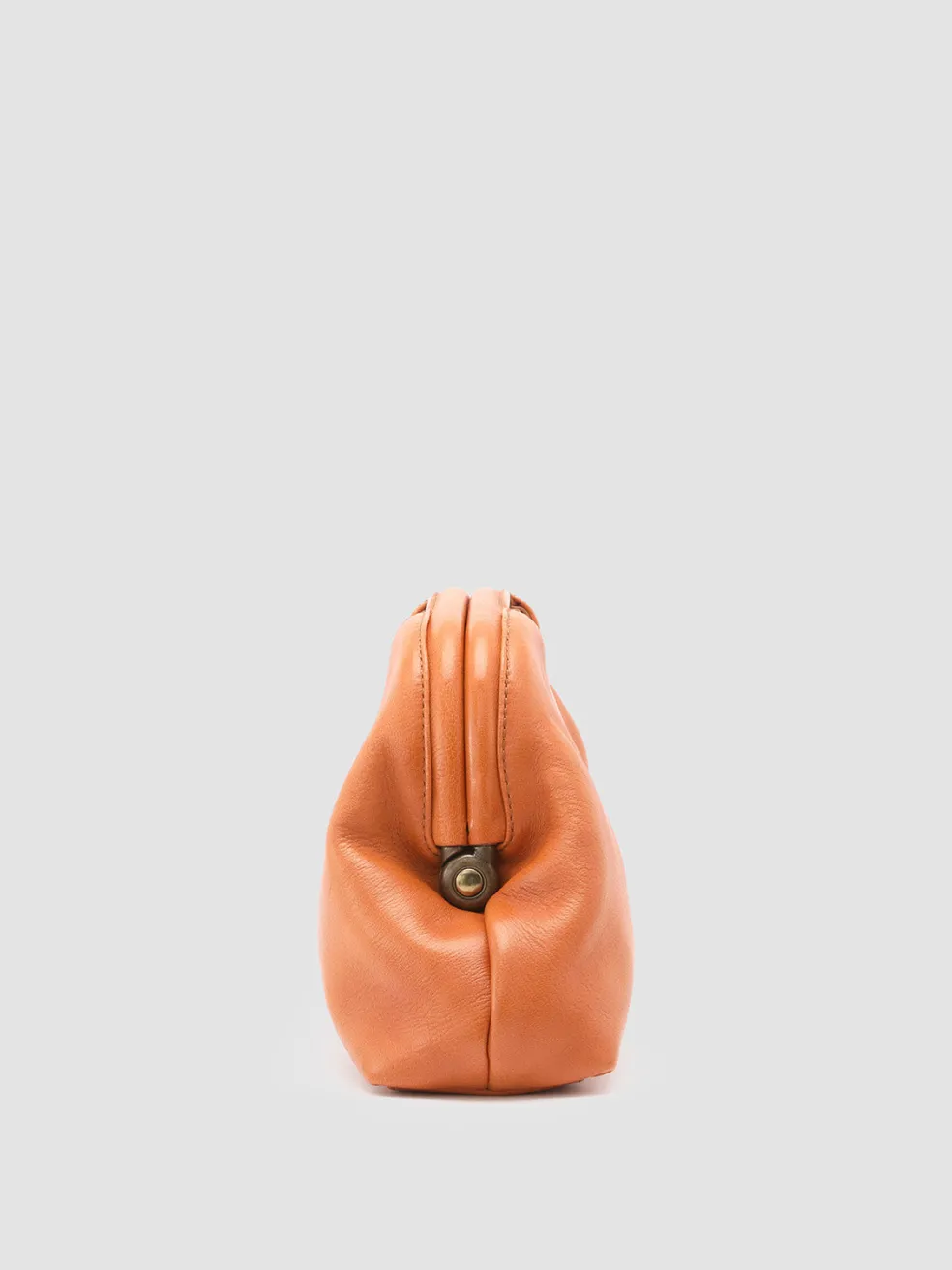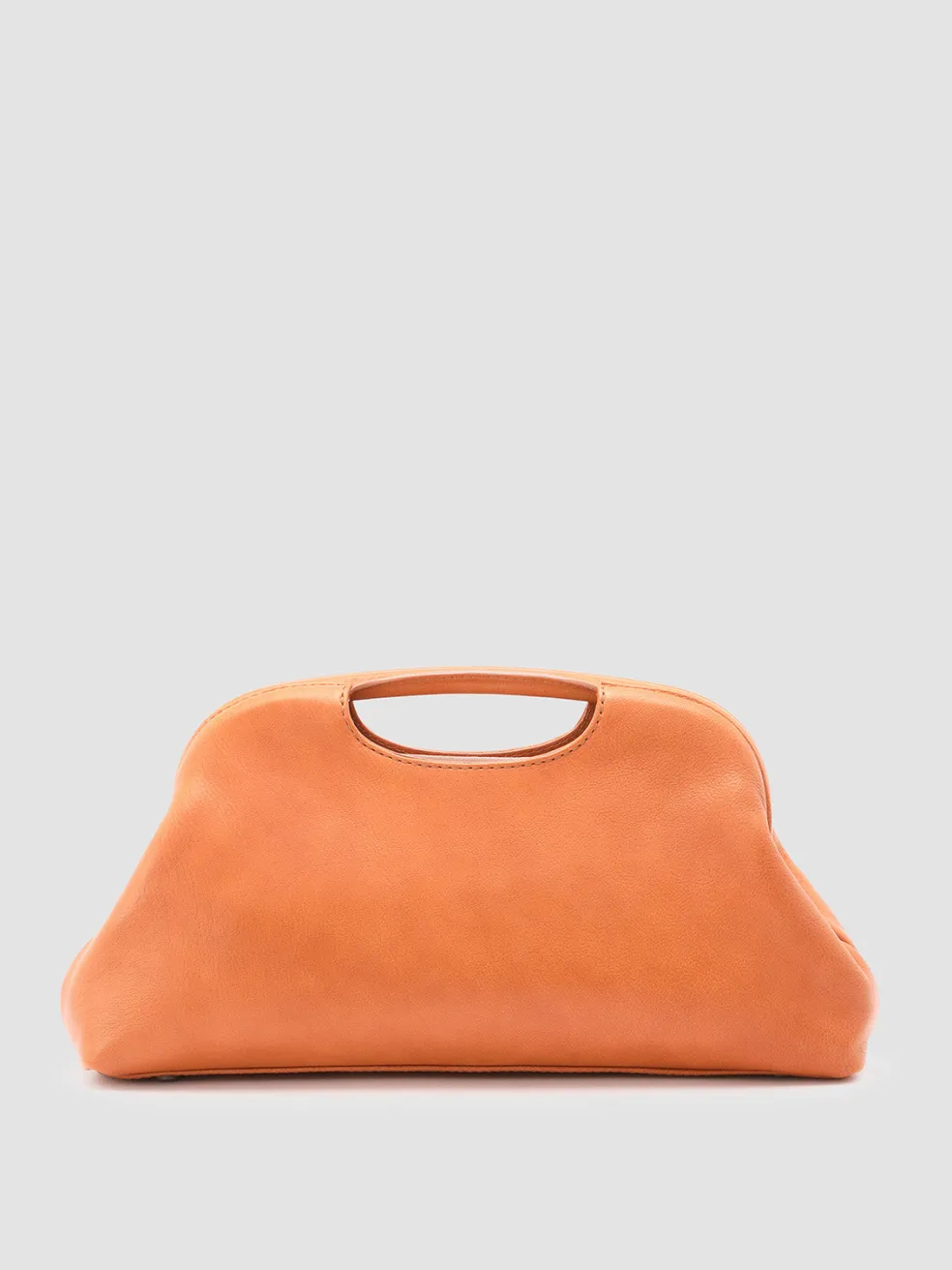 The Helen 02 leather clutch bag is handcrafted in Italy in a sleek orange silhouette with a distinctive oval cut-out handle. The detachable shoulder strap offers versatile carrying options, while the fabric-lined interior is secured by a magnetic button.