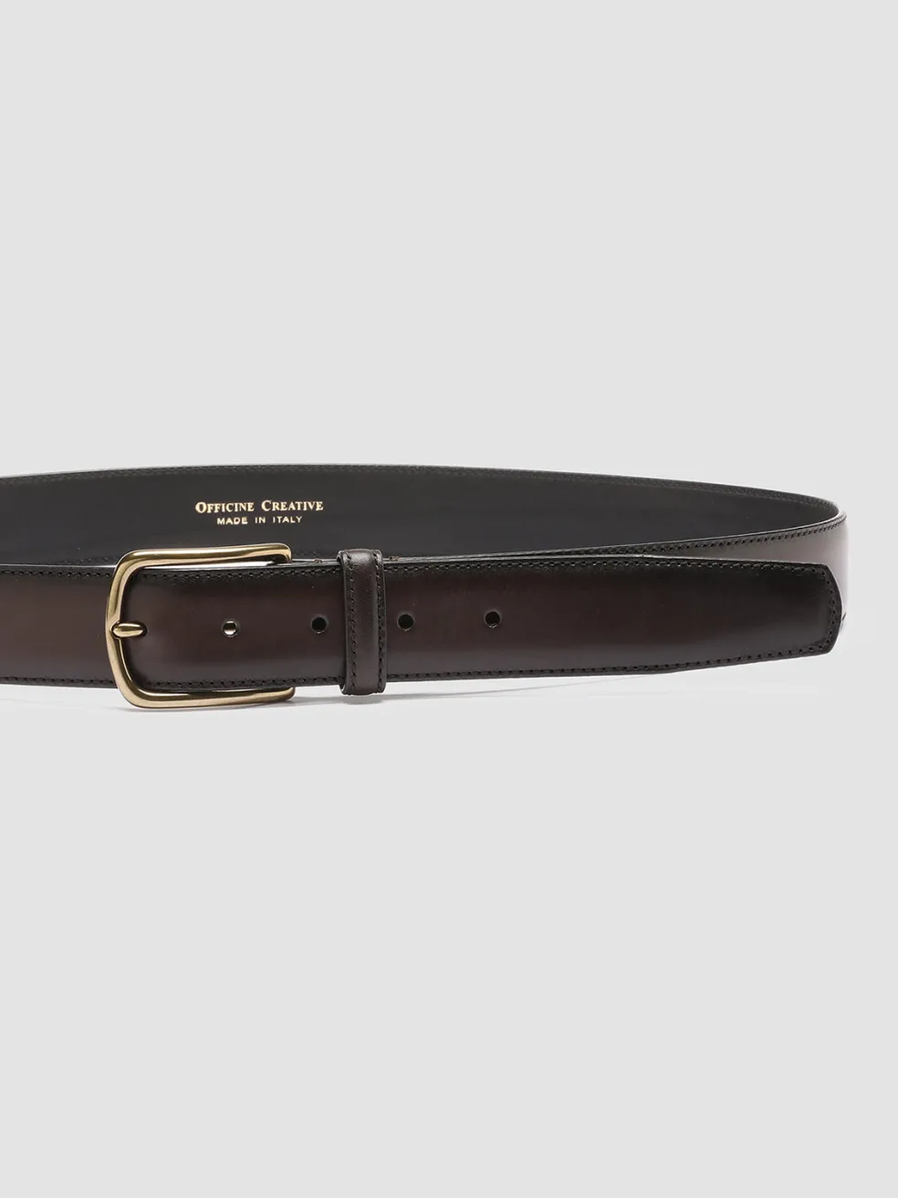 Our OC Strip premium brown leather belt is completely handcrafted and features a versatile and timeless design. It reveals a classic rectangular gold-tone metal buckle and logo lettering printed on the inside.