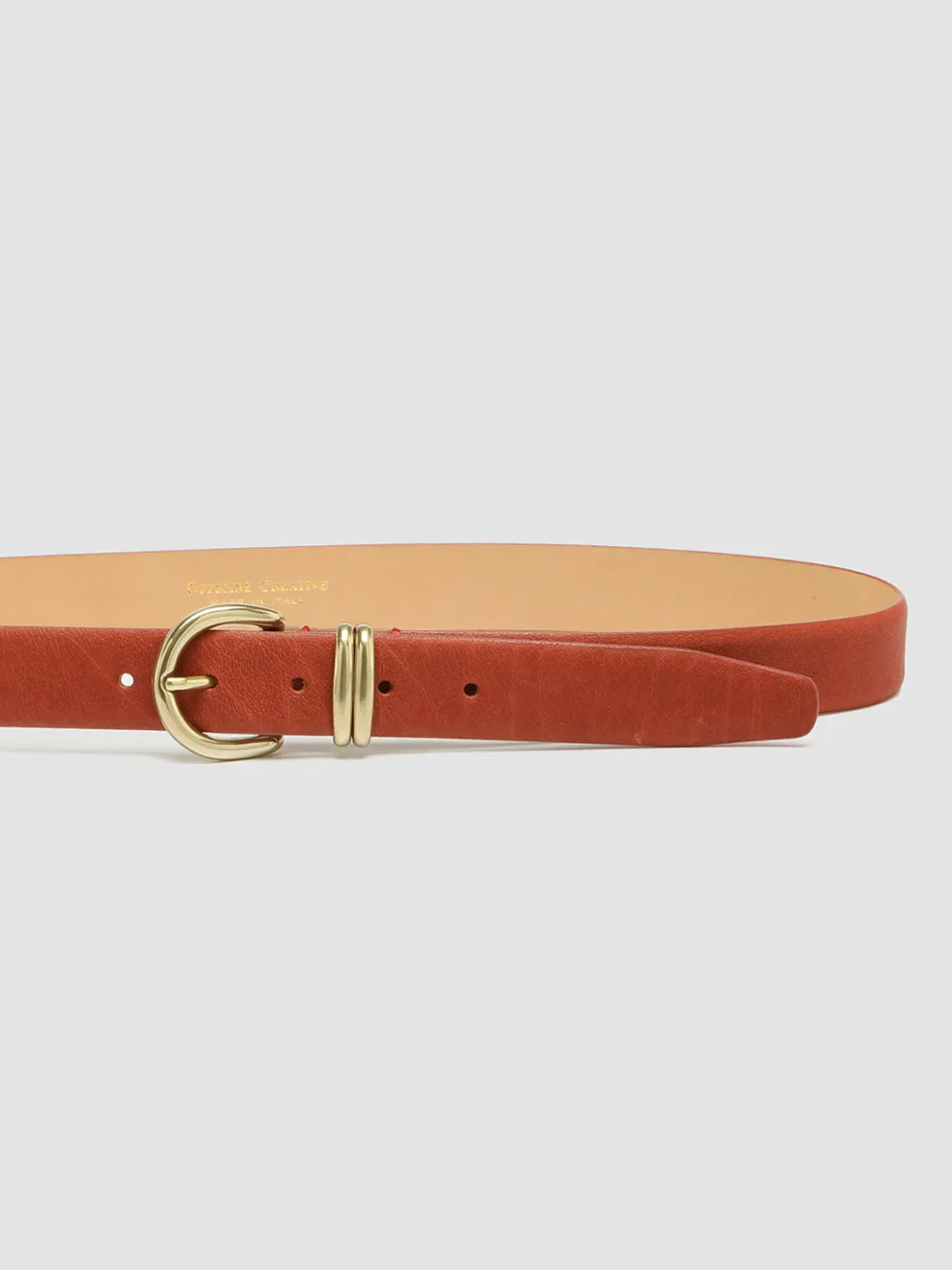 Expertly handcrafted from rust rose leather, our OC Strip artisan belt is a classic and versatile accessory. It features a semi-oval gold-tone metal buckle and our golden lettering logo embossed on the inside.