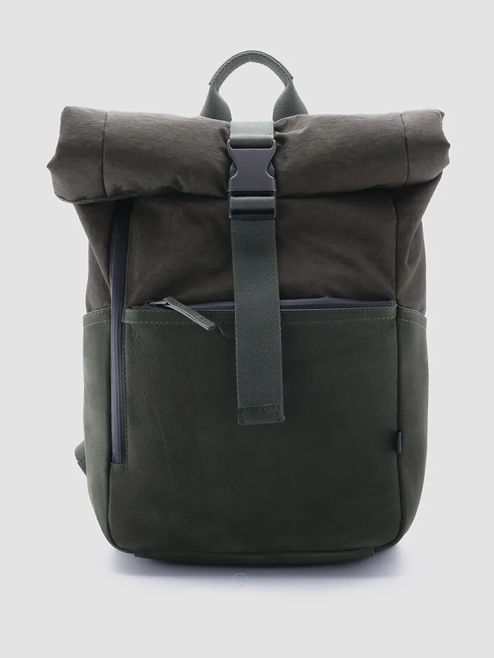 Our Pilot backpack reveals a practical and versatile sport-inspired design and an exceptional craftsmanship. It’s made from supple nabuk leather and nylon in shades of dark green and has a foldable main compartment closed by a side zip and a front hook a zipped pocket at front side open pockets back panel with mesh inserts adjustable rear shoulder straps an inner zip pocket and silver-tone metal hardware.