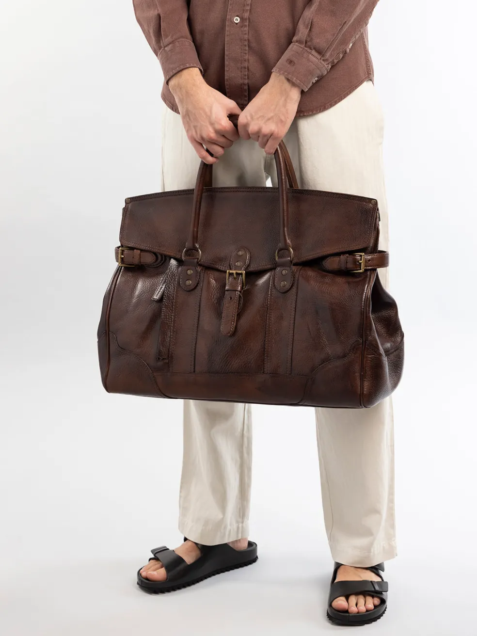 The Rare 042 weekender speaks of understated luxury and durability. Handcrafted in Italy with an eye for detail and a nod to classic elegance, this bag boasts a luxurious brown grained leather and is designed to cater to all travel needs thanks to a spacious interior, complemented by robust top handles and a versatile, detachable shoulder strap.